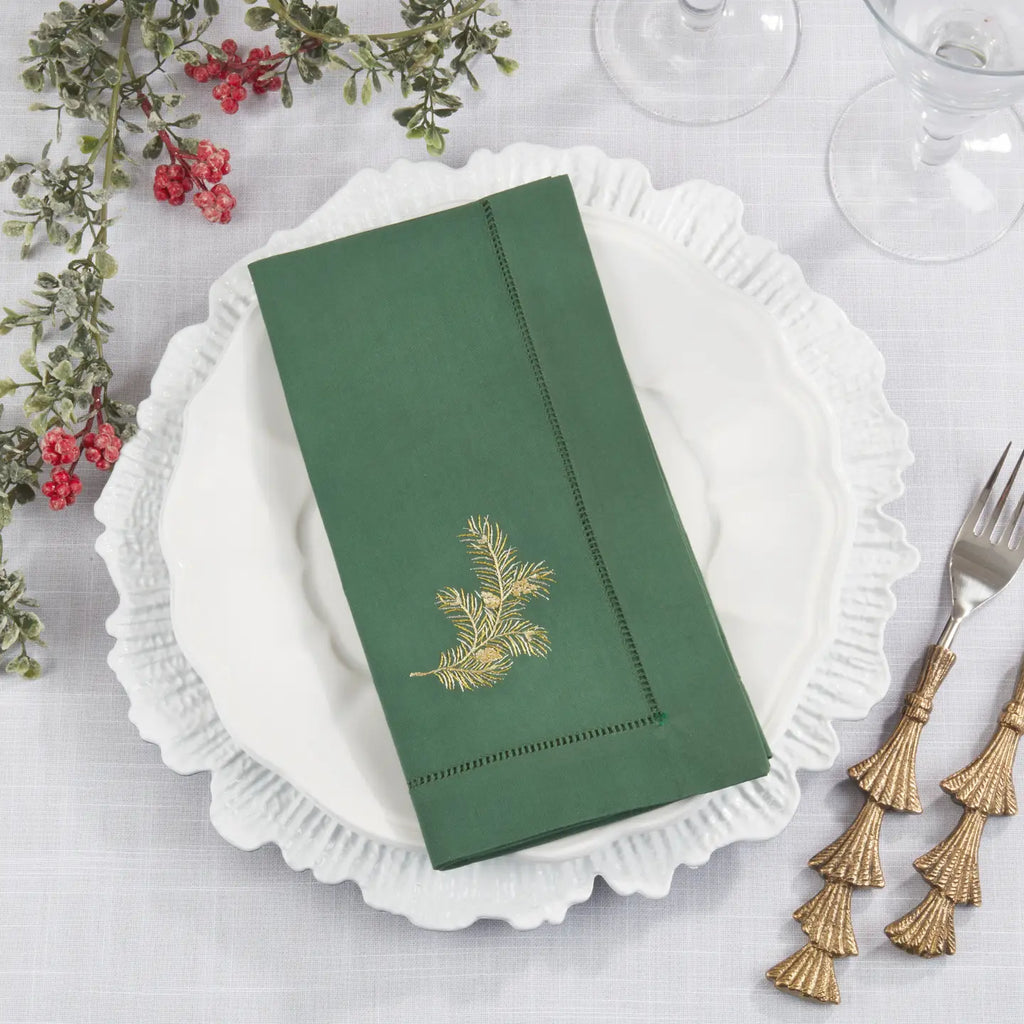 SET of 6 Jasper Green Embroidered Pine Needle Hemstitch Napkins