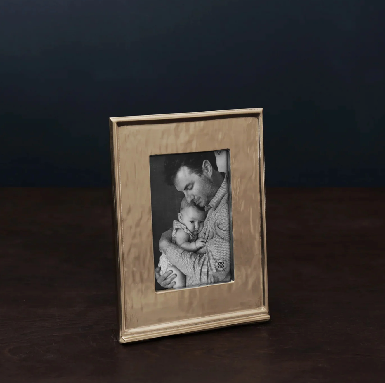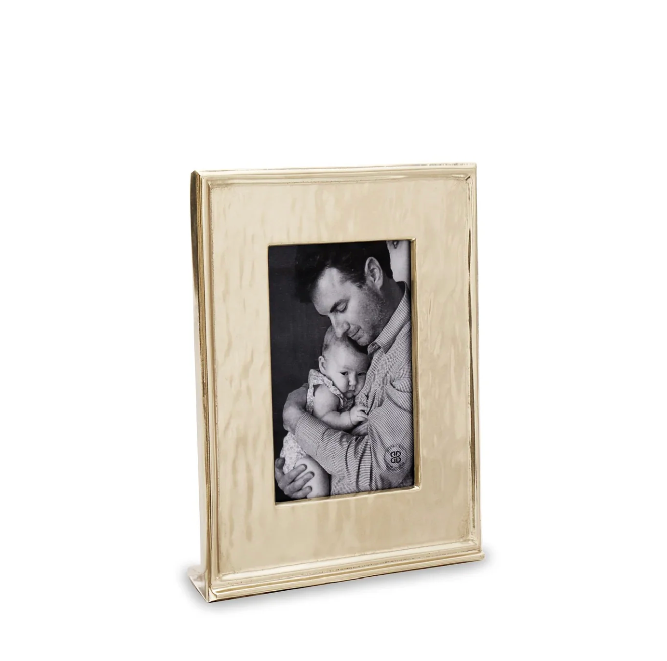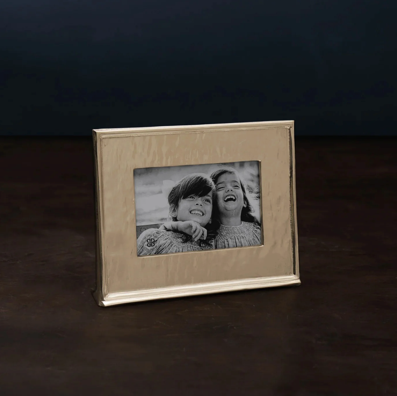 Golden years. Your memories are golden, and this frame surrounds your favorite 4x6 horizontal photo in a golden hue. A brilliant look when displayed on the mantle, desk, or shelf. Composed of a metal alloy, the frame features a sumptuously textured surface rendered fresh and new with a proprietary metallic finish. Keeps its shine and never needs polishing, the frame has been designed to stand without the aid of support. Designer says of the shimmering simplicity of these frames, "Love this cool new finish, it glimmers like moonlight on water." Employs eco-friendly and sustainable materials and is crafted by artisans who trace a heritage of metalworking for generations. Sustainably handmade of a top quality, easy-care, aluminum alloy. Tarnish free.