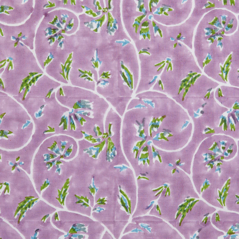 A block-printed botanical vine print, Marguerite adds a splash of color to any space. The imagined leaf-like floral blooming across the undulating vine was inspired by arid gardens in southern India. The lavender adds a happy splash to your table. Handmade on 100% cotton fabric. Hand printed.
