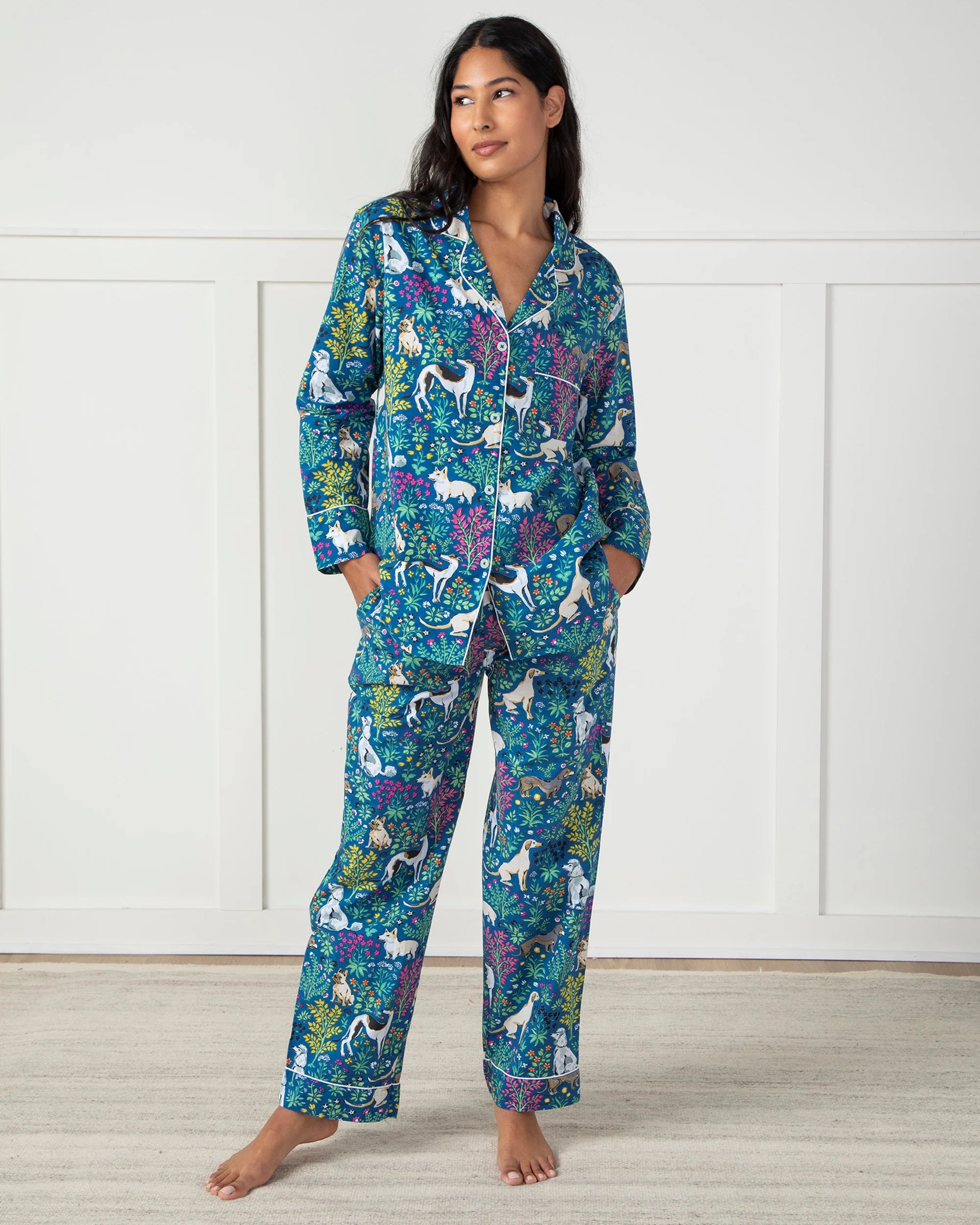 100% organic cotton poplin. The cutest pajamas come homeward-bound to you. A tail-wagging worthy print ready for canine companion snuggles. Gets softer with every cycle. Hand screen-printed by artisans. Pockets for storing essentials. Button-down top with relaxed fit that's roomy and chic. Mid-rise pants with elastic waistband, adjustable drawstring, and 28" inseam. Fits true to size.