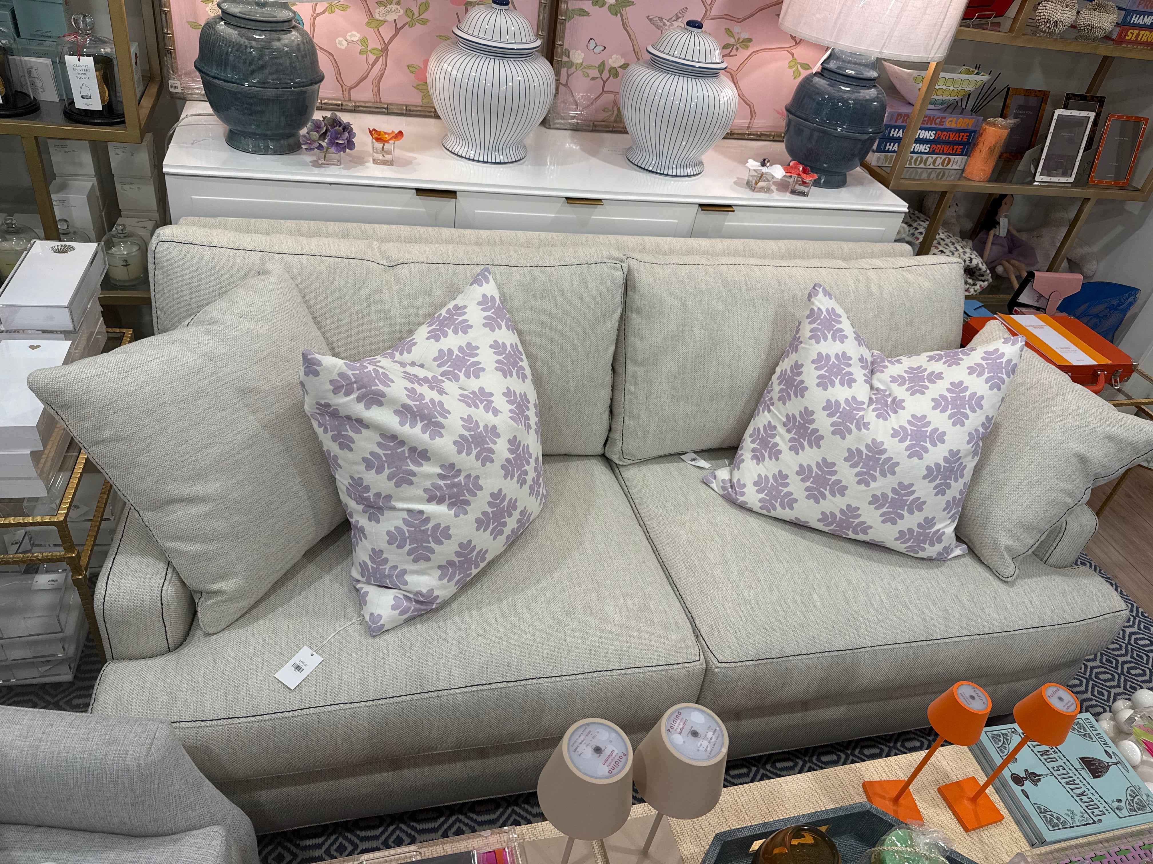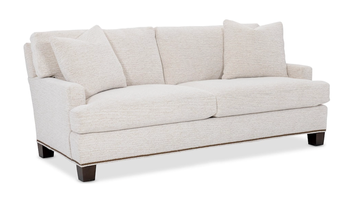 Fabric & stitching is as shown in second & third photos. 28% acrylic, 56% cotton, 4% linen, 12% polyester. Slubs and striations are inherent. Dye lots will vary. Chalk finish. Marine cablestitch in place of topstitch. Marine cablestitch on arm border, backs, cushions, & pillow. Naturallee cushion. No nailheads.