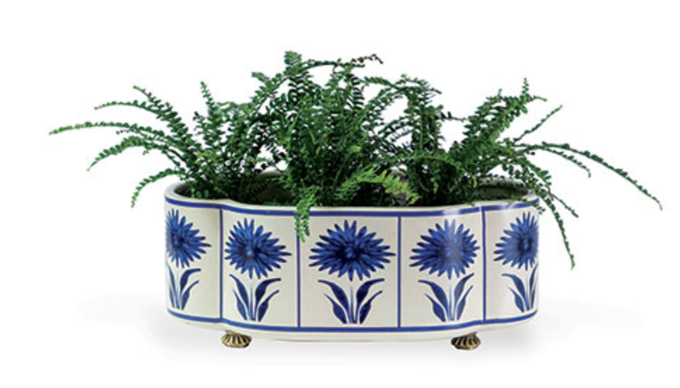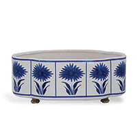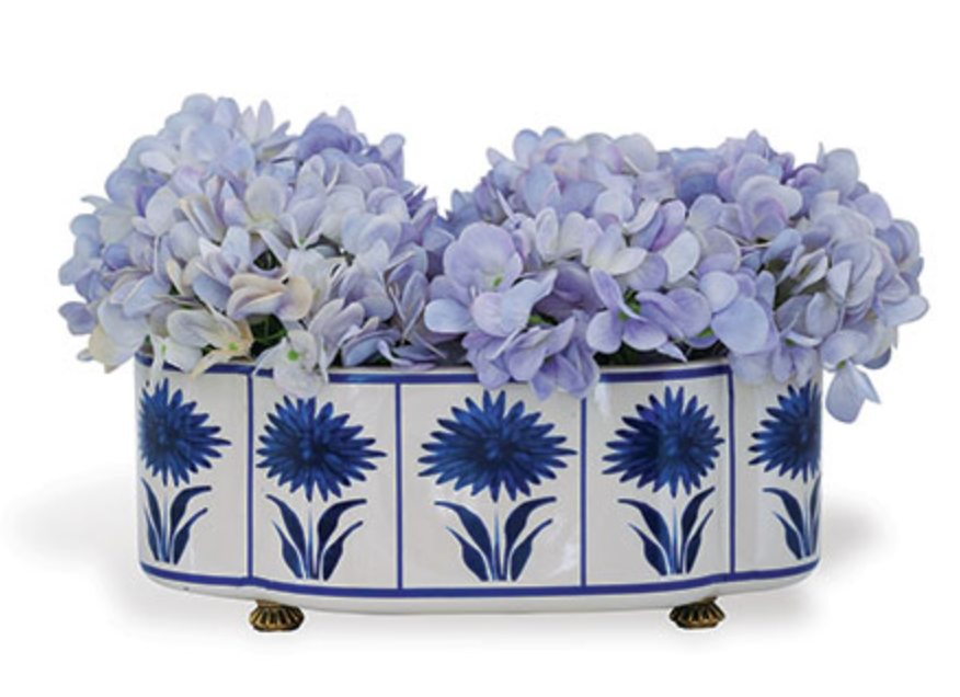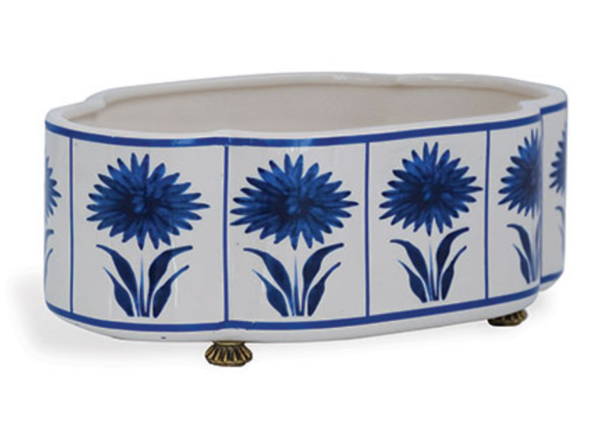 Blue asters and cream ground oval porcelain planter. For small plants, fresh fruit or fresh flowers, the planter is accented with solid brass feet.