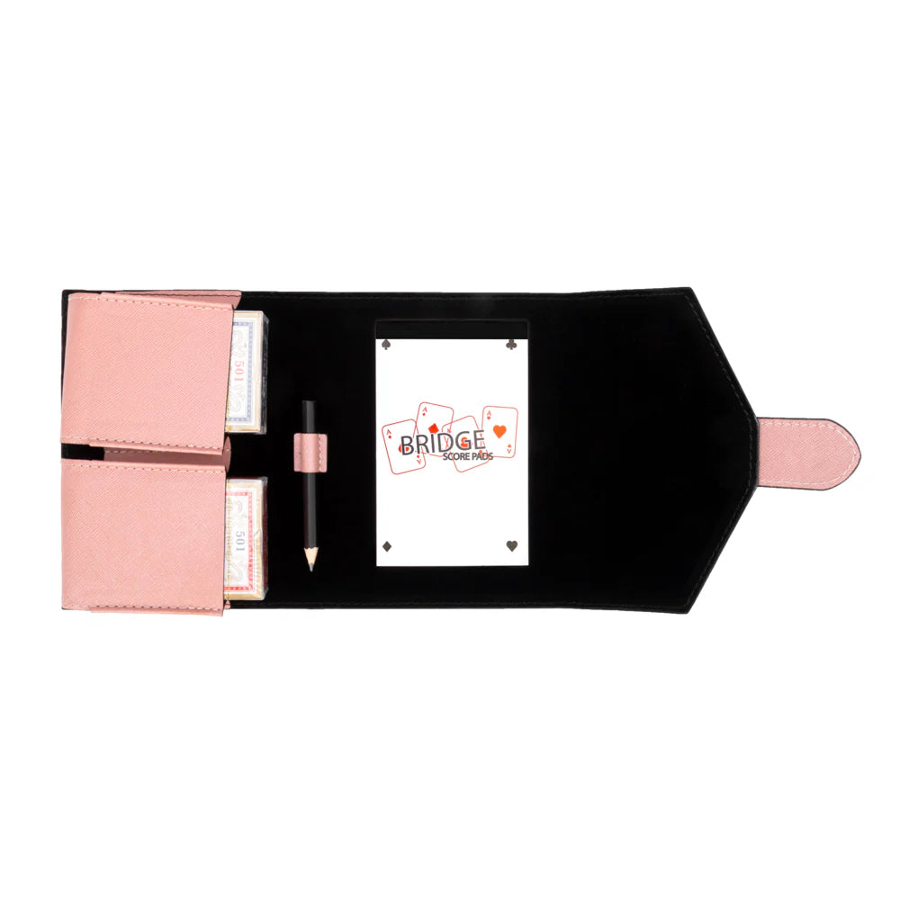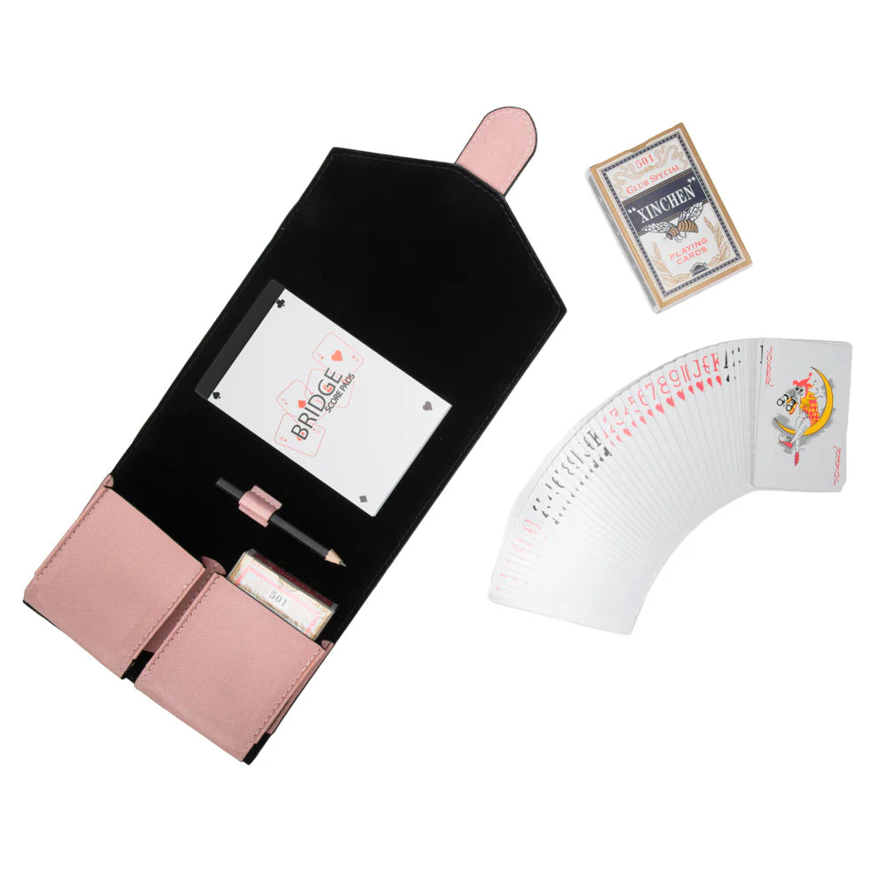 The ultimate stylish game playing experience. Set features two decks of vinyl-coated bridge cards, in a luxurious vegan leather case, plus a pencil, and score card for keeping score. Take your game anywhere and show off your style with this modern twist on tradition! The bold design makes it the perfect gift for fashionable professionals who want practical items for their travels.