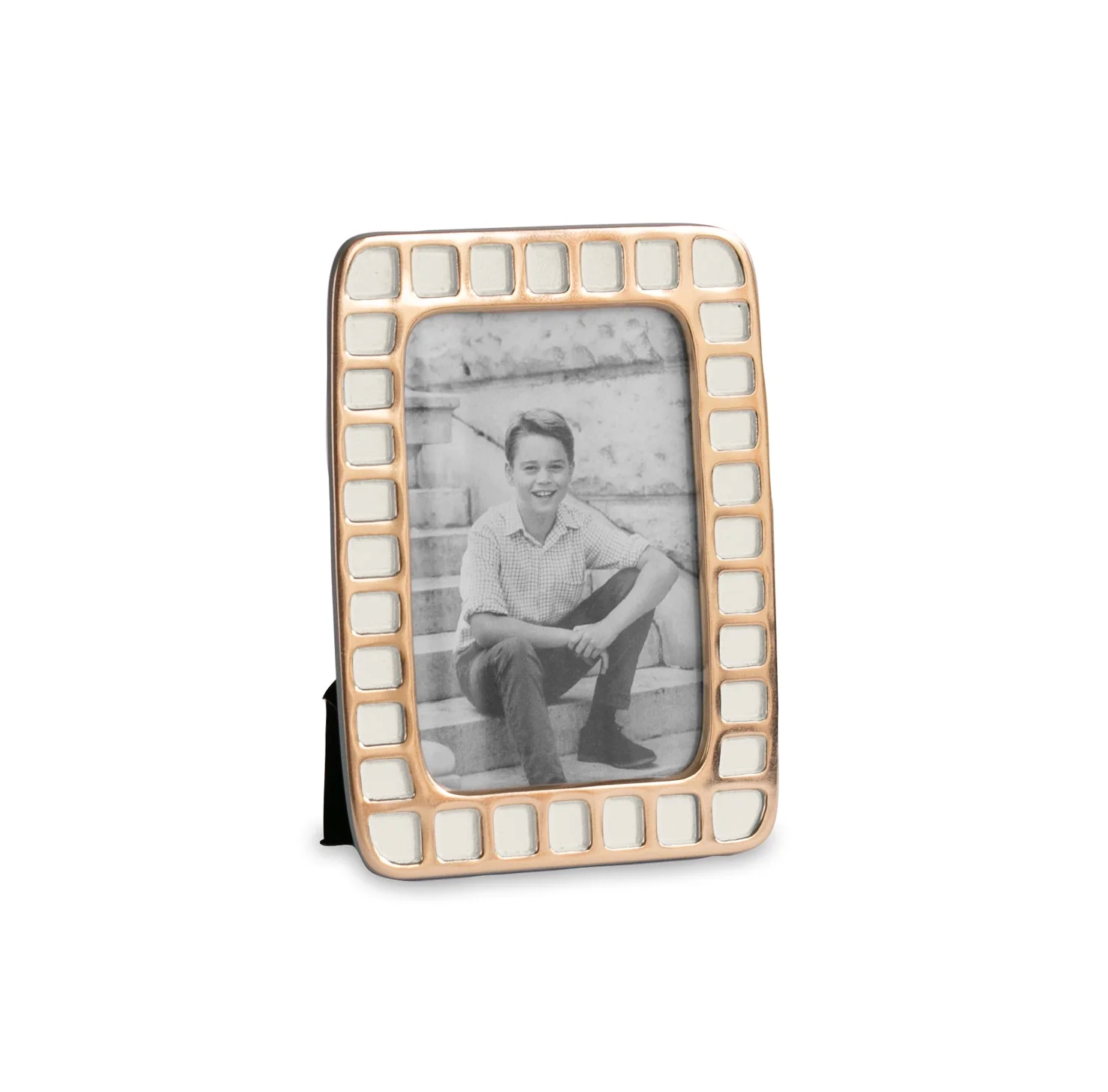 The very essence of sophisticated contemporary design, strikingly presented in colorfully enameled metal, rimmed in gold. With a rectangular shape decorated with gold-rimmed squares, the frame is ideal for displaying your favorite photo. Of heirloom quality, this frame may be displayed vertically or horizontally and makes a perfect gift for any occasion. This handsome enameled frame will add a distinctive decorative touch to any room and will be cherished for years to come. Uses eco-friendly and sustainable materials and crafted by artisans who trace a heritage of metalworking for generations. Made of a top quality, easy-care, aluminum alloy with an enamel finish.