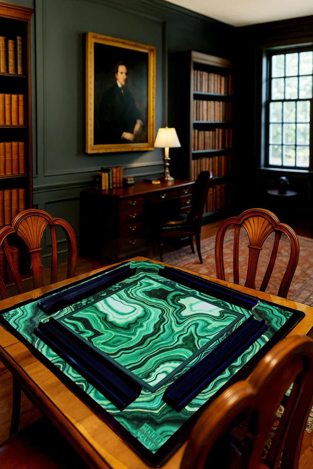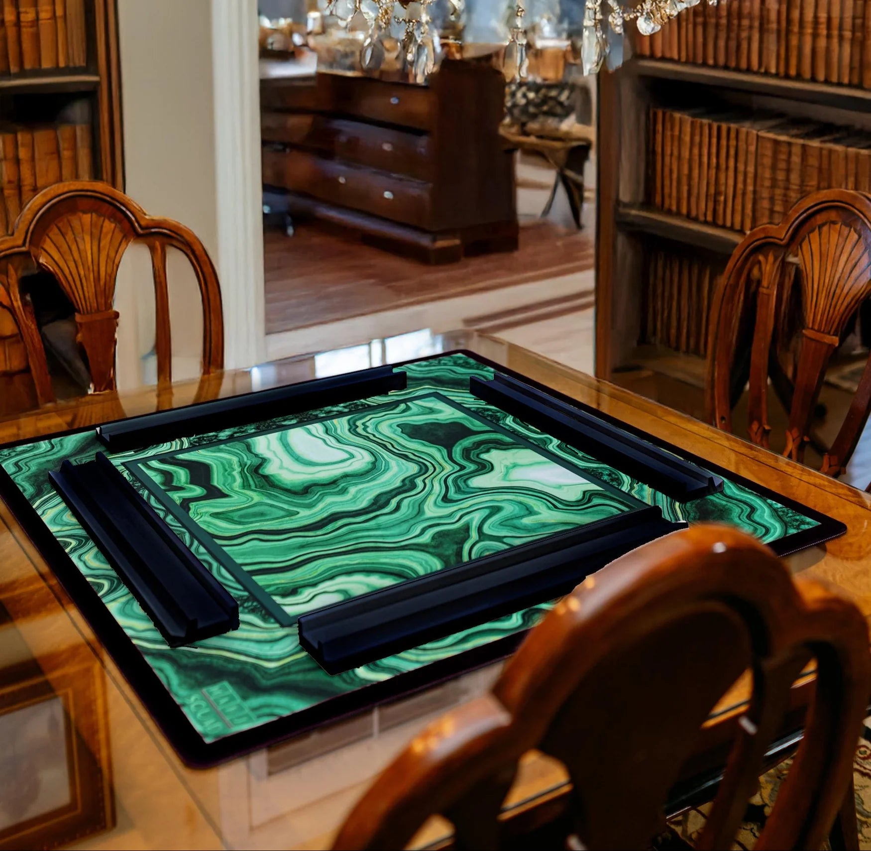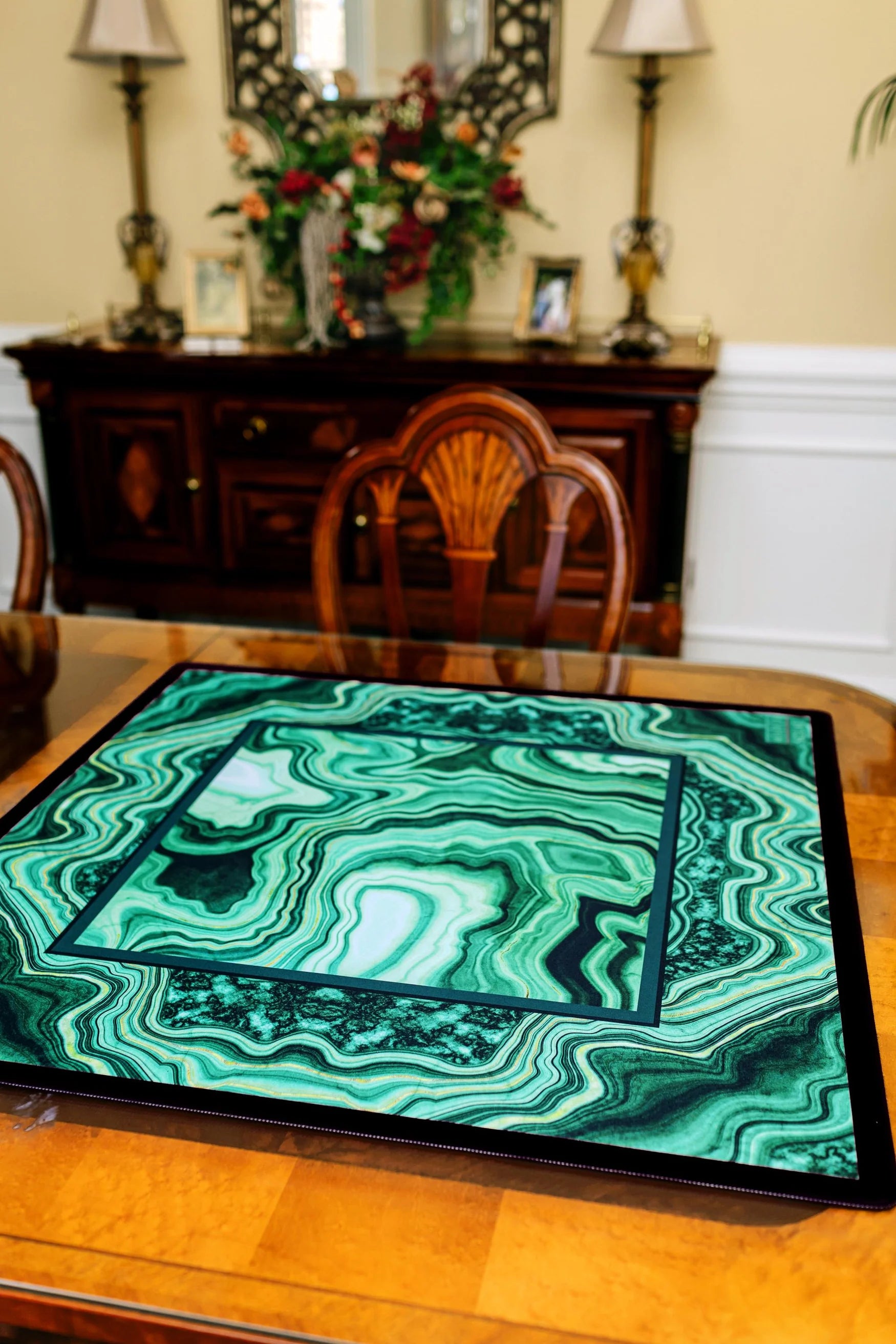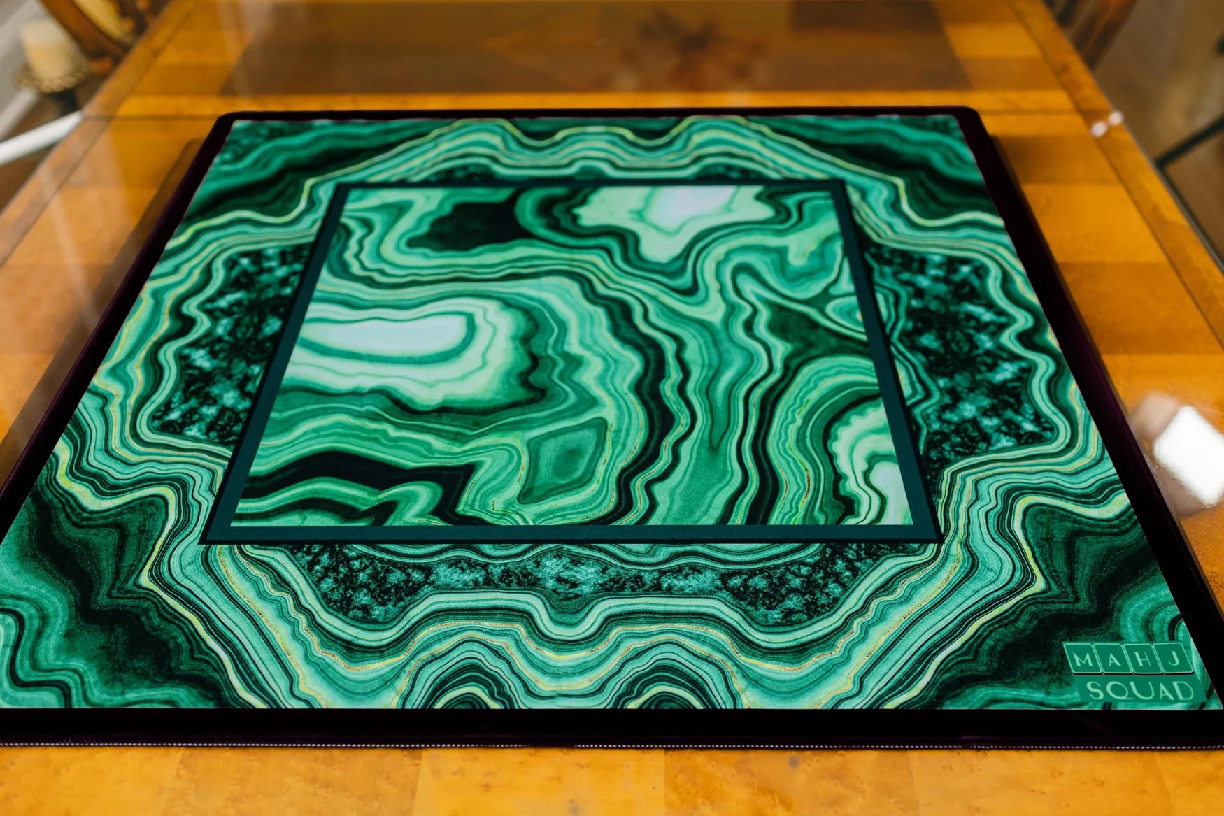 Resembles the luxurious stone malachite with rich deep jewel tones. Bordered with jewel toned magenta that really makes the emerald green pop! High quality and durable neoprene fabric with a rubber backing and stitched finished edges. The tiles will slide smoothly across without and wrinkling of the mat. The rubber backing keeps it firmly in place and flat. This style of mat also reduces the noise of the Mahjong tiles. It is easily foldable or rolled. Easily cleaned as well. Spot cleaning recommended initially but can be washed on delicate or cold cycle then laid flat to dry.