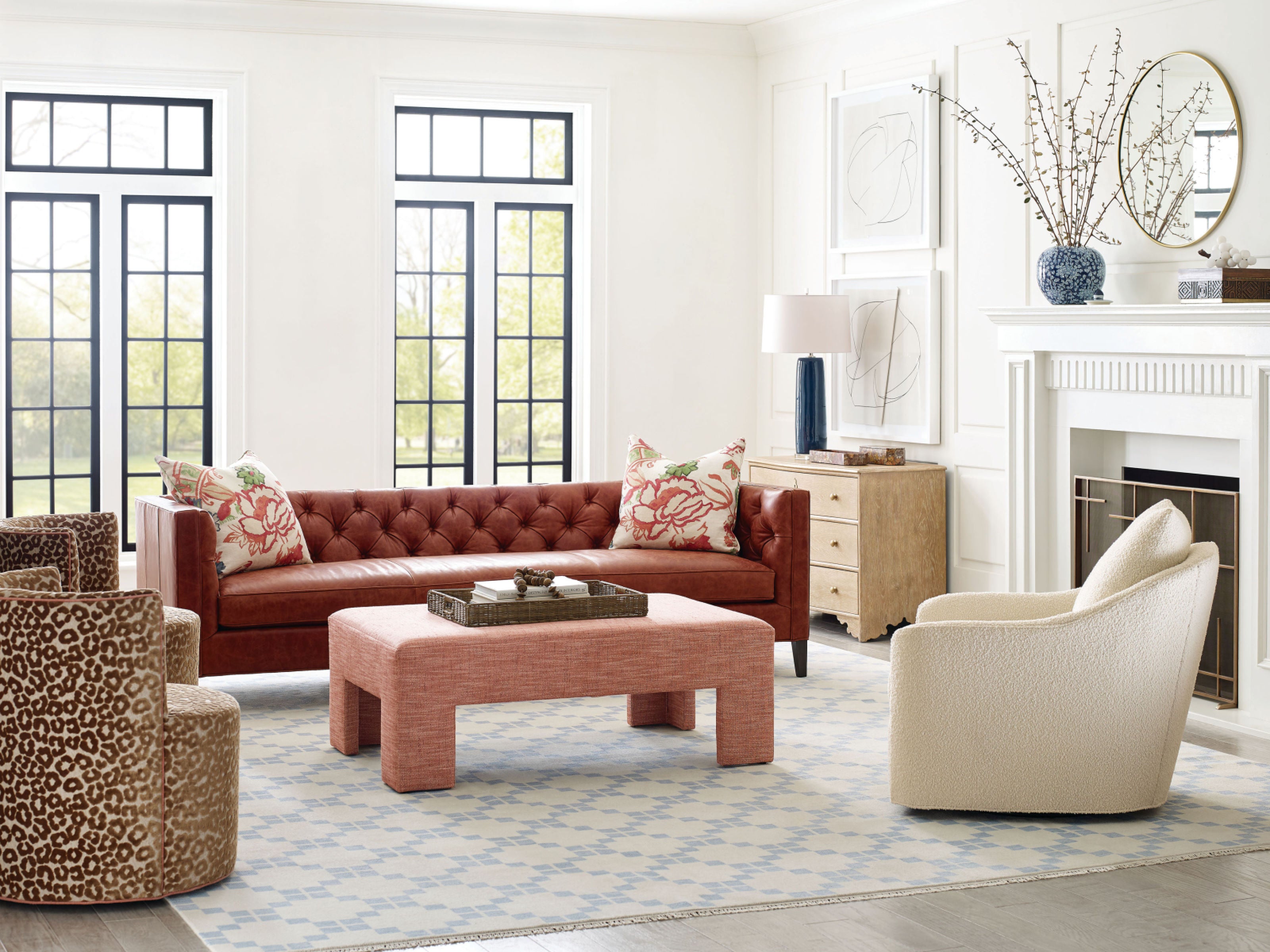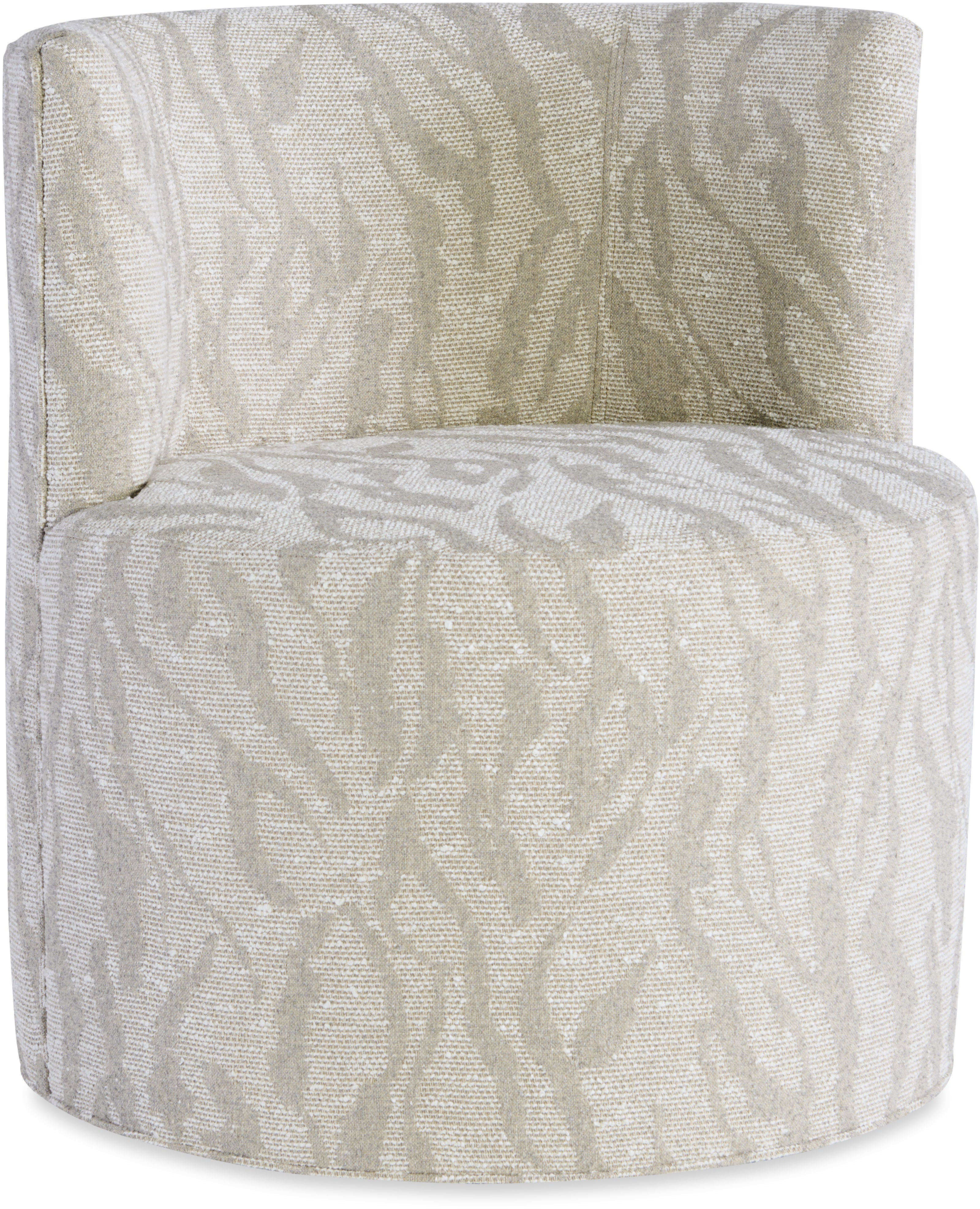 Fabric is as shown in second photo. 78% acrylic/22% polyester. Small scale animal skin design created from soft, chenille yarns. Saddle stitched. 5 recessed ball casters. Seat tight. Back tight.