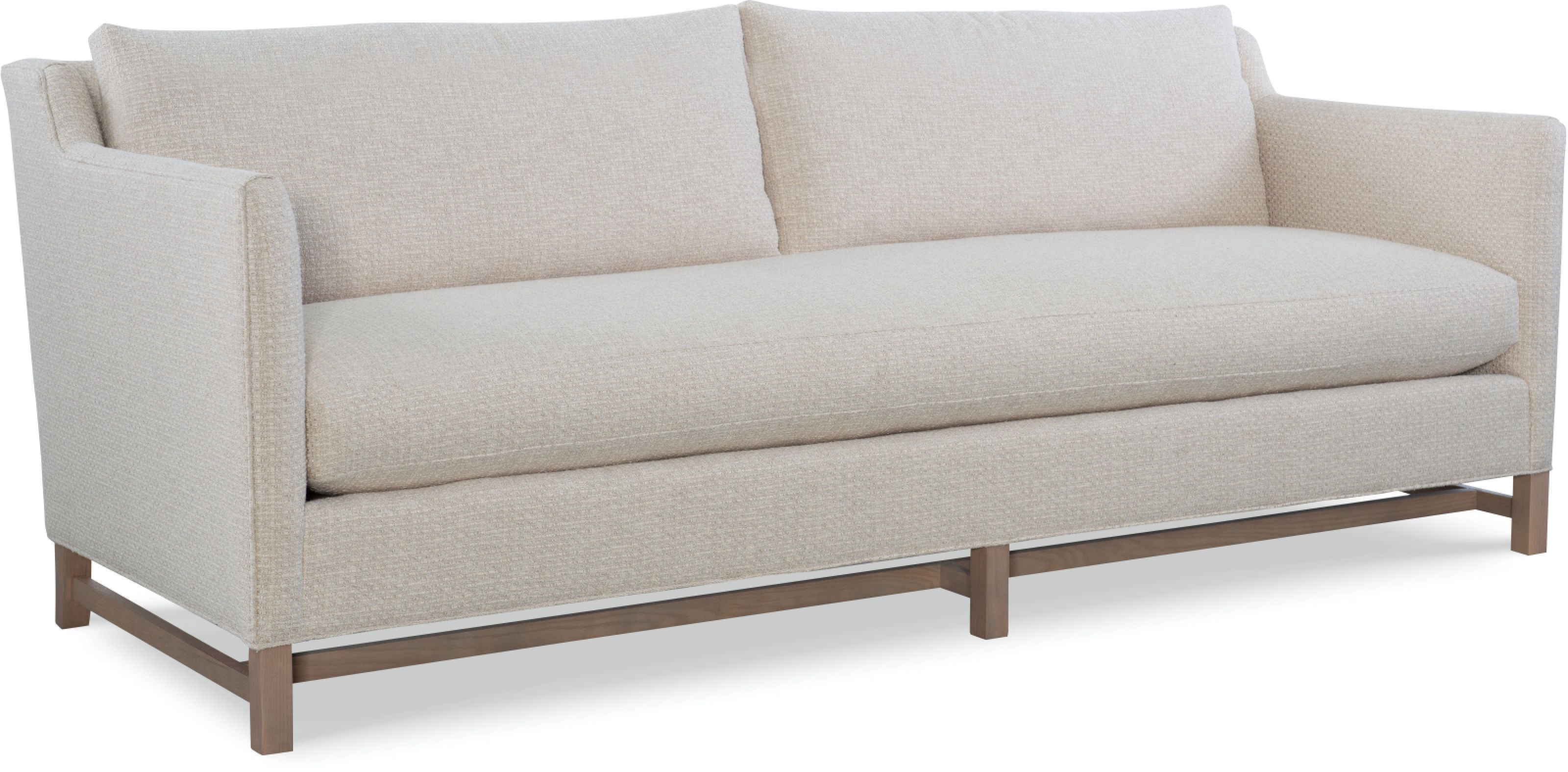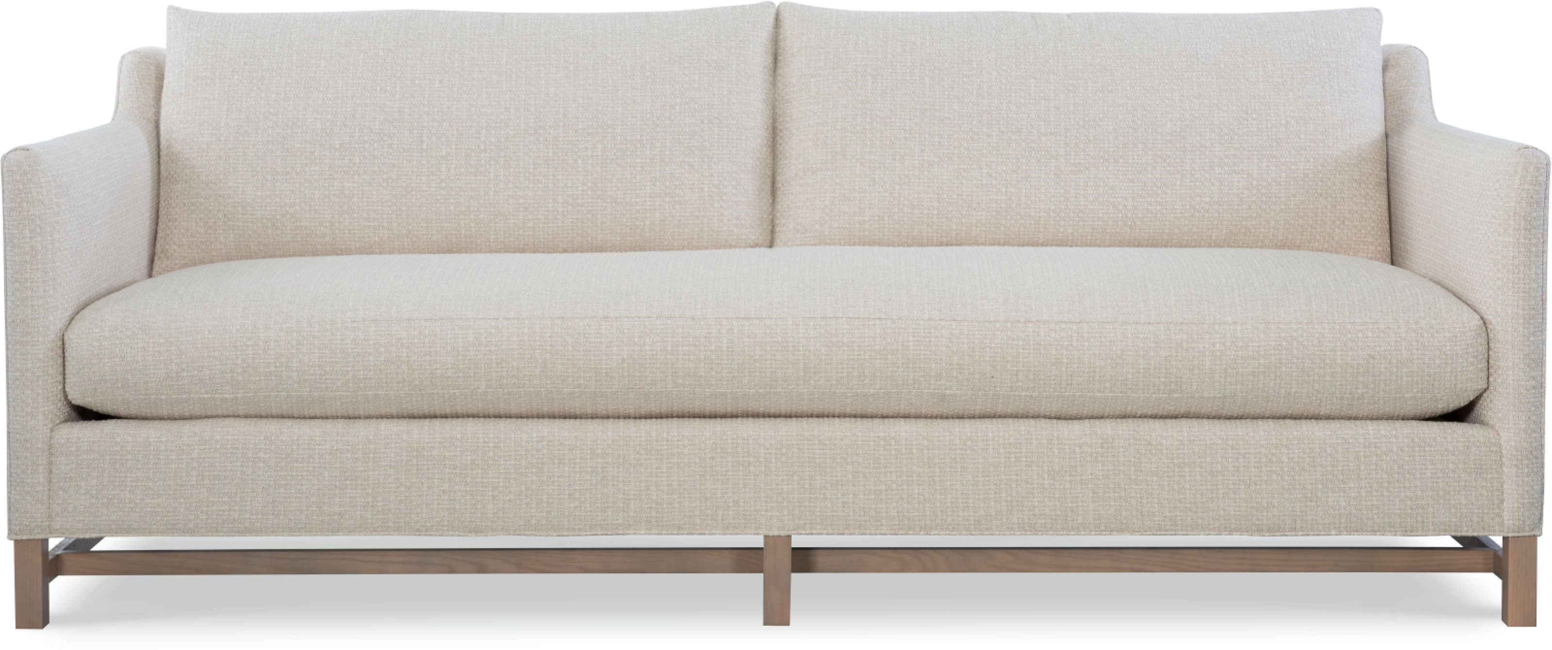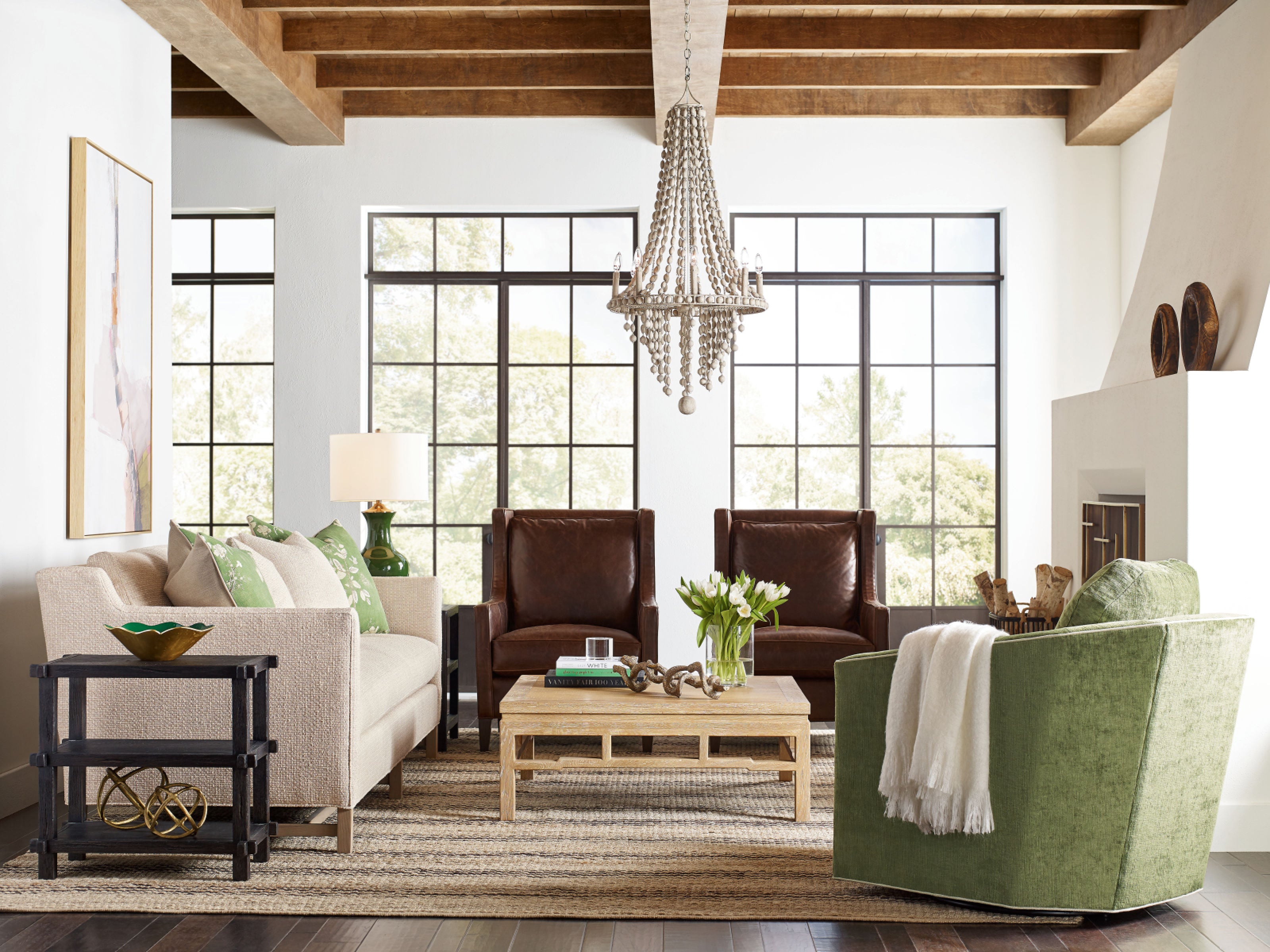 Main fabric is shown in first and second photos. Sahara finish is shown in first and third photos. Subtle tonal variations of this versatile solid fabric complement diverse patterns and colors. Arm sleeves. Comfort down back and seat cushion. Loose box border back. Weltless cushions.