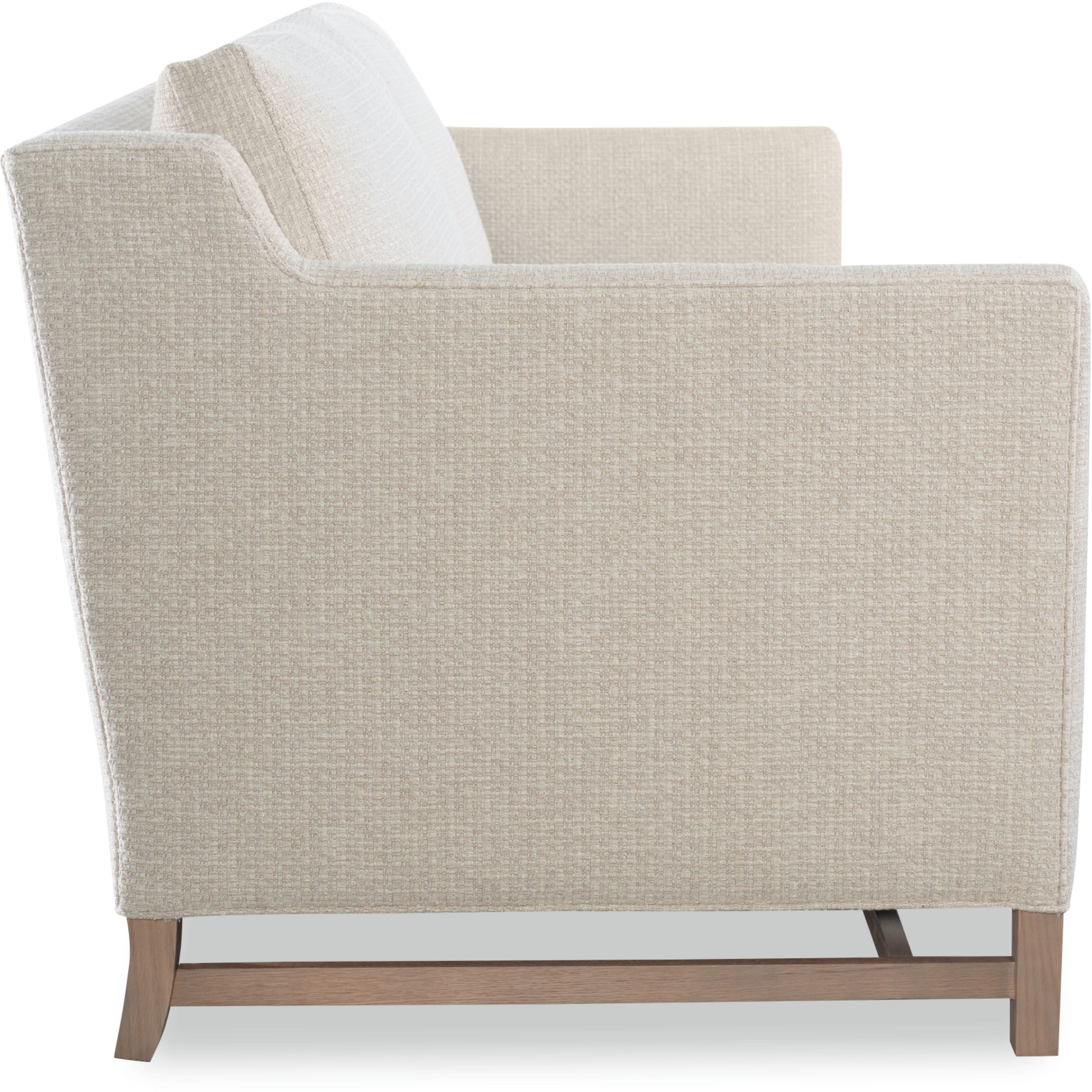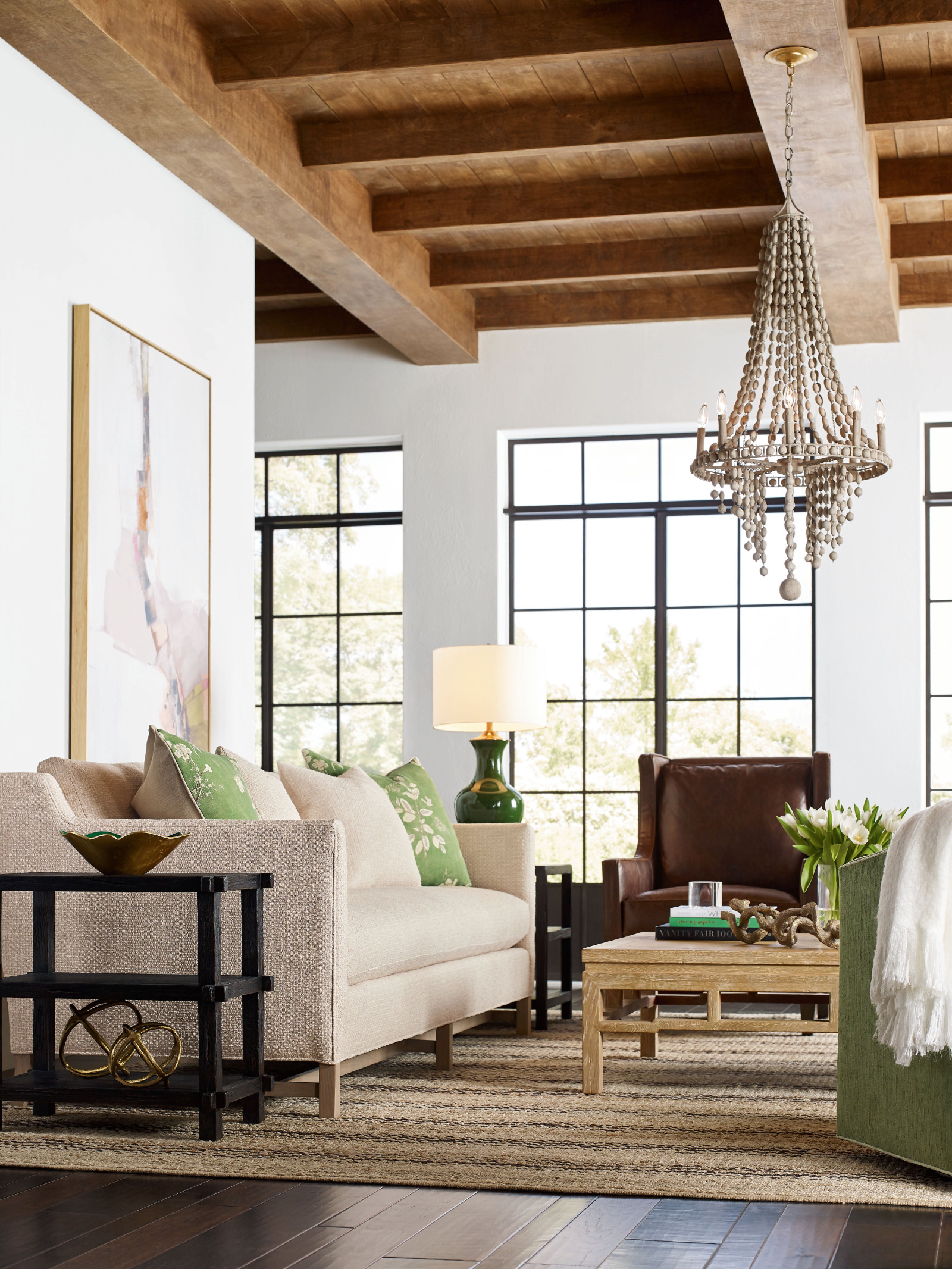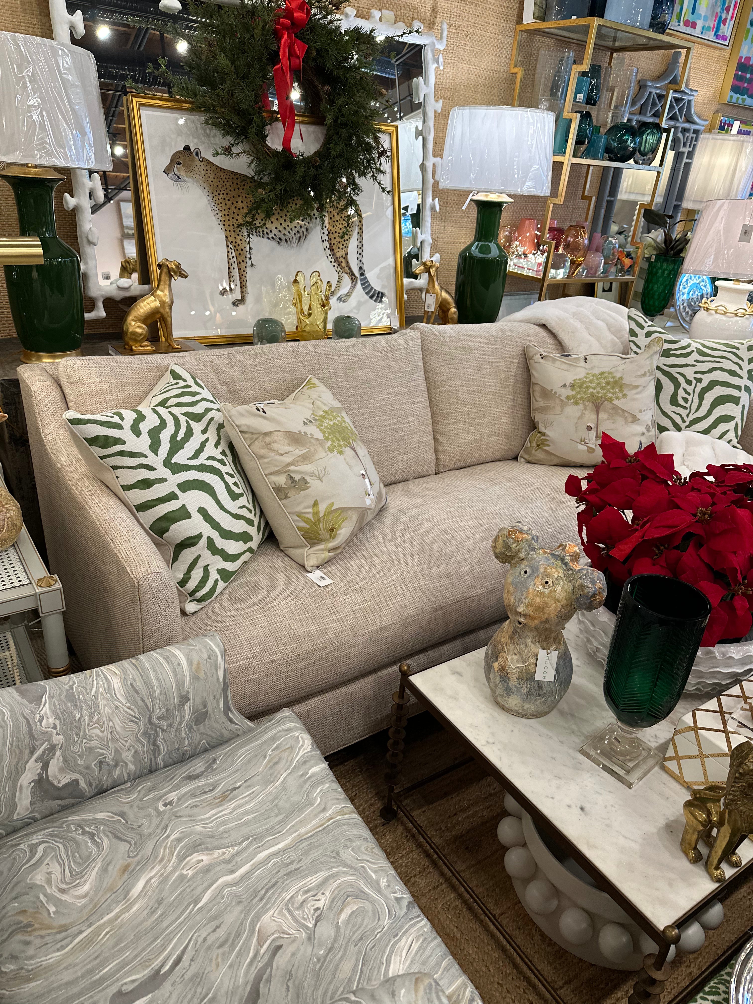Main fabric is shown in first and second photos. Sahara finish is shown in first and third photos. Subtle tonal variations of this versatile solid fabric complement diverse patterns and colors. Arm sleeves. Comfort down back and seat cushion. Loose box border back. Weltless cushions.