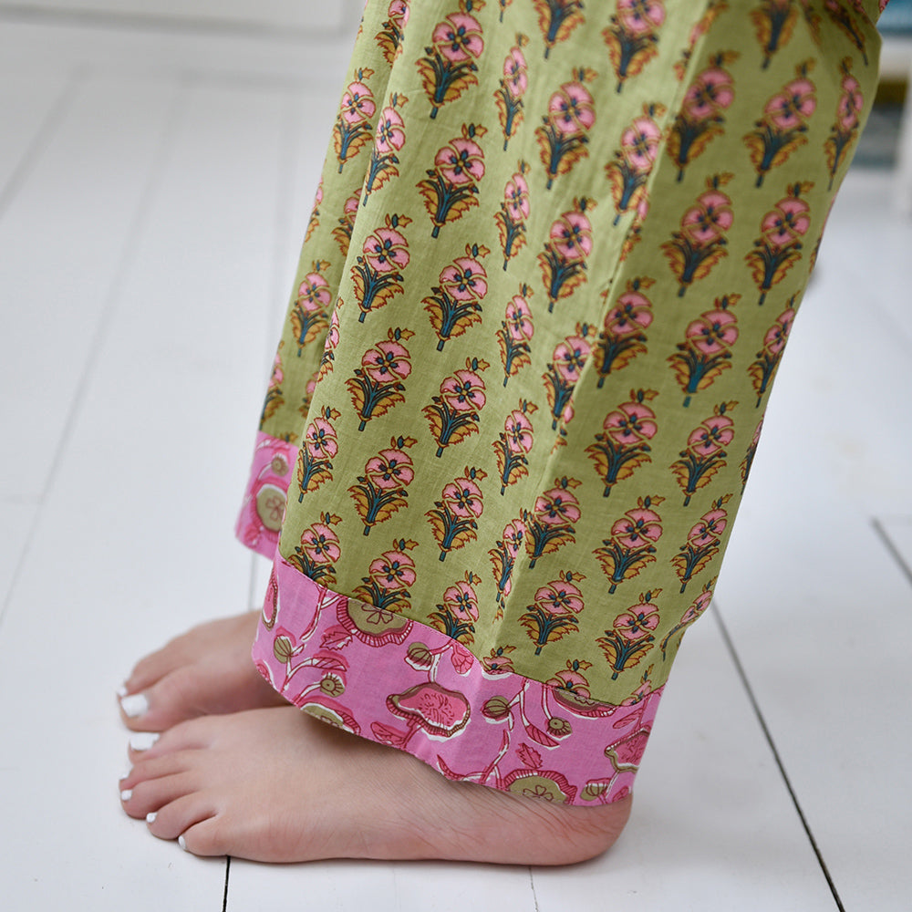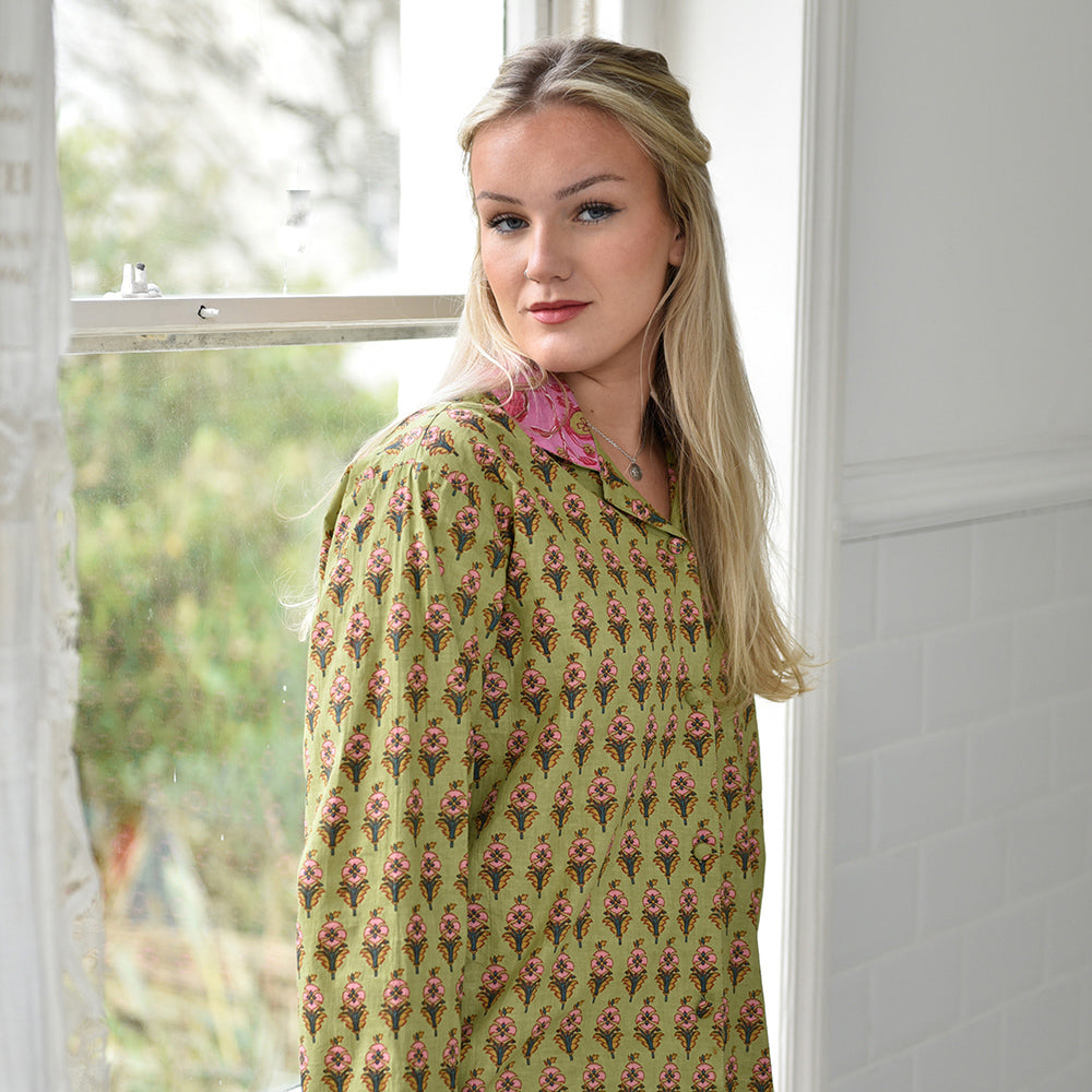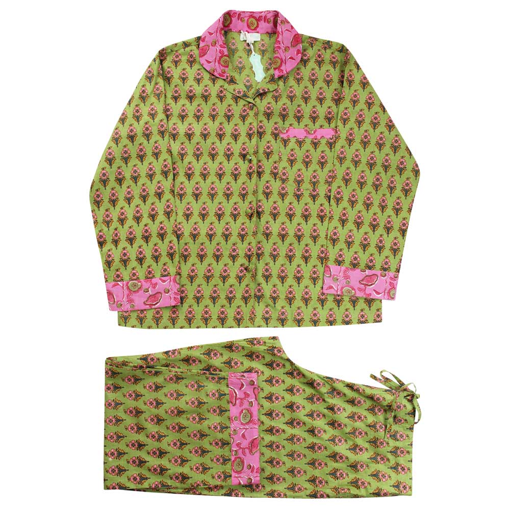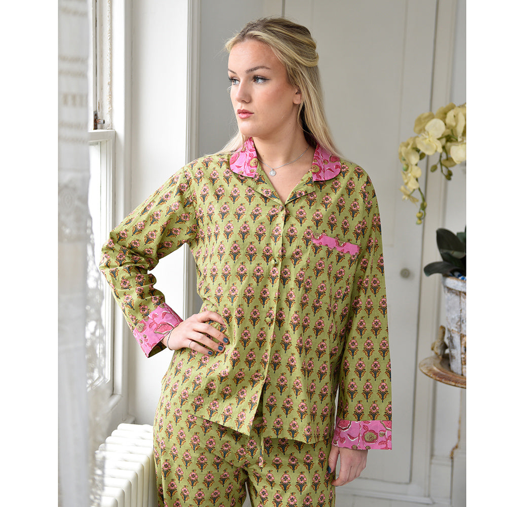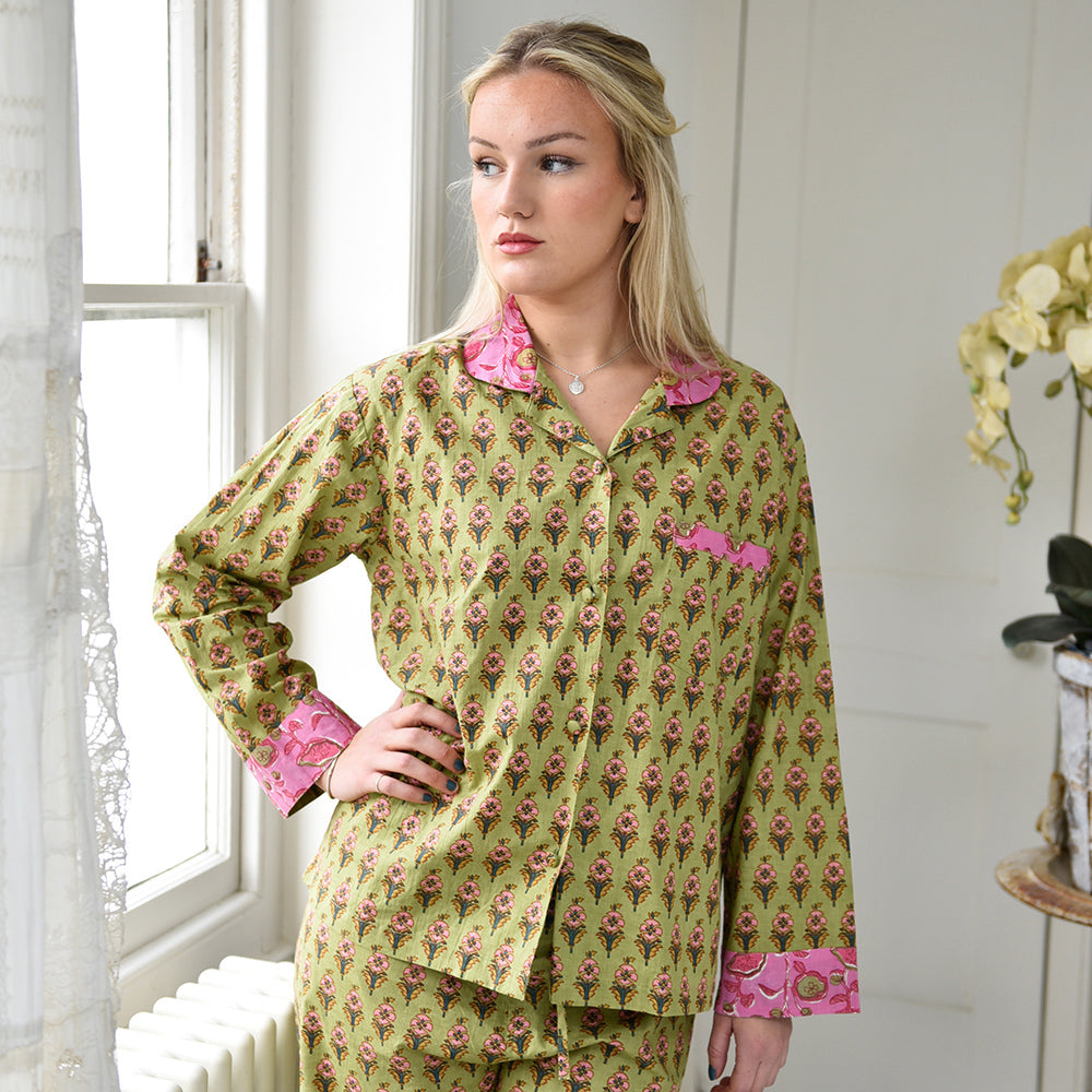Make bedtime zing with these lime green and pink small block floral print pajamas! This fresh lime green background makes the repeated pink flower block print pattern on the fabric really pop, the collar, cuffs and pocket trim are in a complimentary pink which has a dark pink and lime floral design. The pajama jacket fastens with fabric-covered buttons and has a single breast pocket, and the trousers have an elasticated drawstring waist for comfort. 100% cotton. Full-length sleeves.