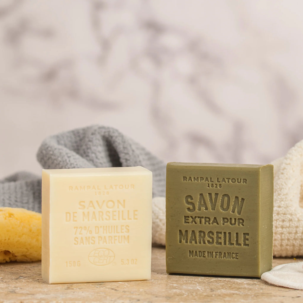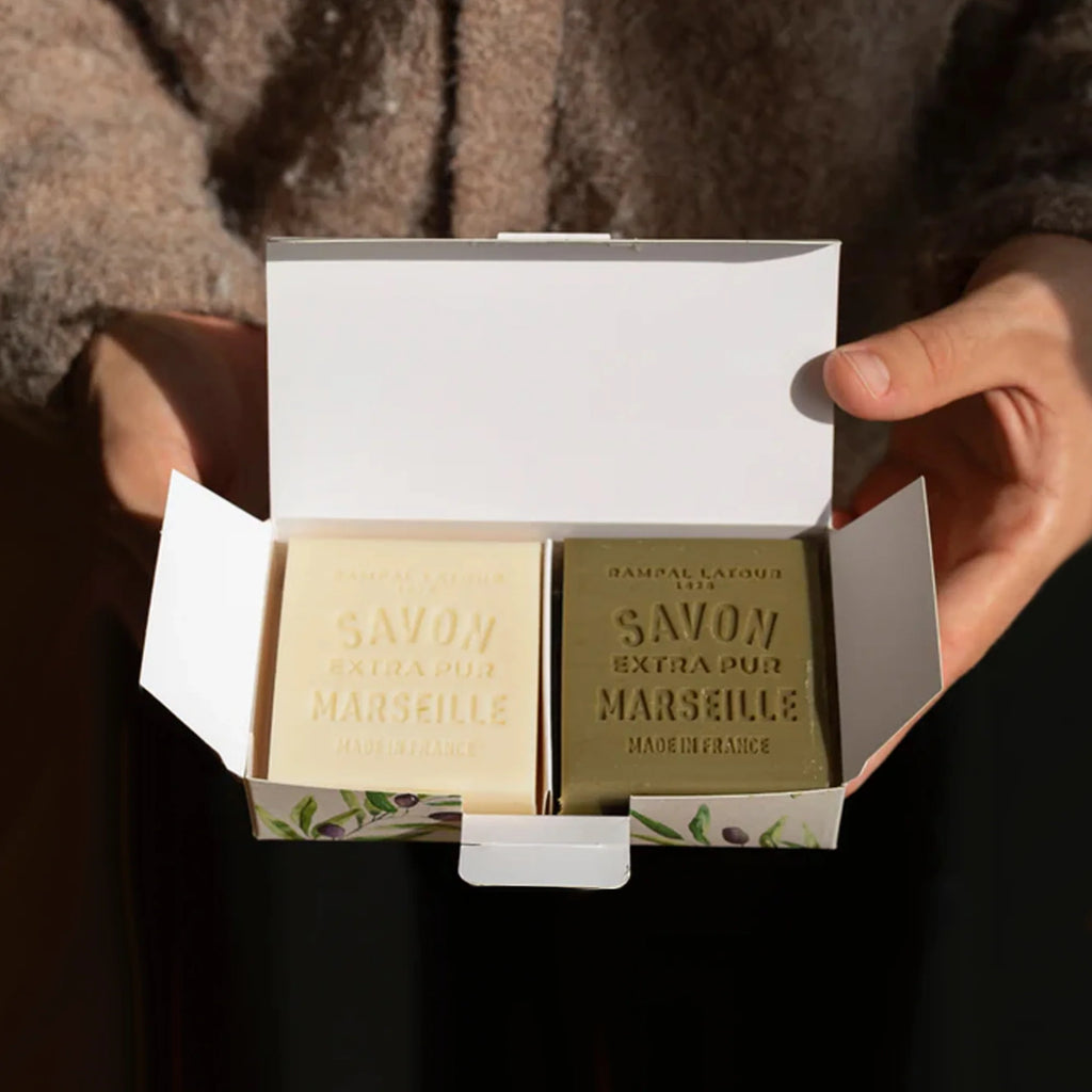 The perfect gift set! These two Rampal Latour Marseille soaps quickly become part of anyone's daily routine. White Marseille soap with 100% vegetable oils is gentle on your face and body, it is rich in vegetable glycerin naturally produced during saponification (more than 7%). Thanks to this, your skin is hydrated every day. The traditional green Marseille soap with olive oil is suitable for frequent use, it will not dry out your skin. It contains as much glycerin as a moisturizer, i.e. 2.5%. This soap is your perfect multi-purpose ally for the home. It is also suitable for hand washing. This French tradition is the perfect gift for any home. Hypoallergenic. Fragrance free. Colorant free. Preservative free. For home & body care. Moisturizing. Made in Provence, France. Designed and manufactured in their workshops in Provence, for over one hundred years. This is a 'COSMOS NATURAL' product certified by Ecocert Greenlife according to the highest European standards. Eco-friendly gift box.