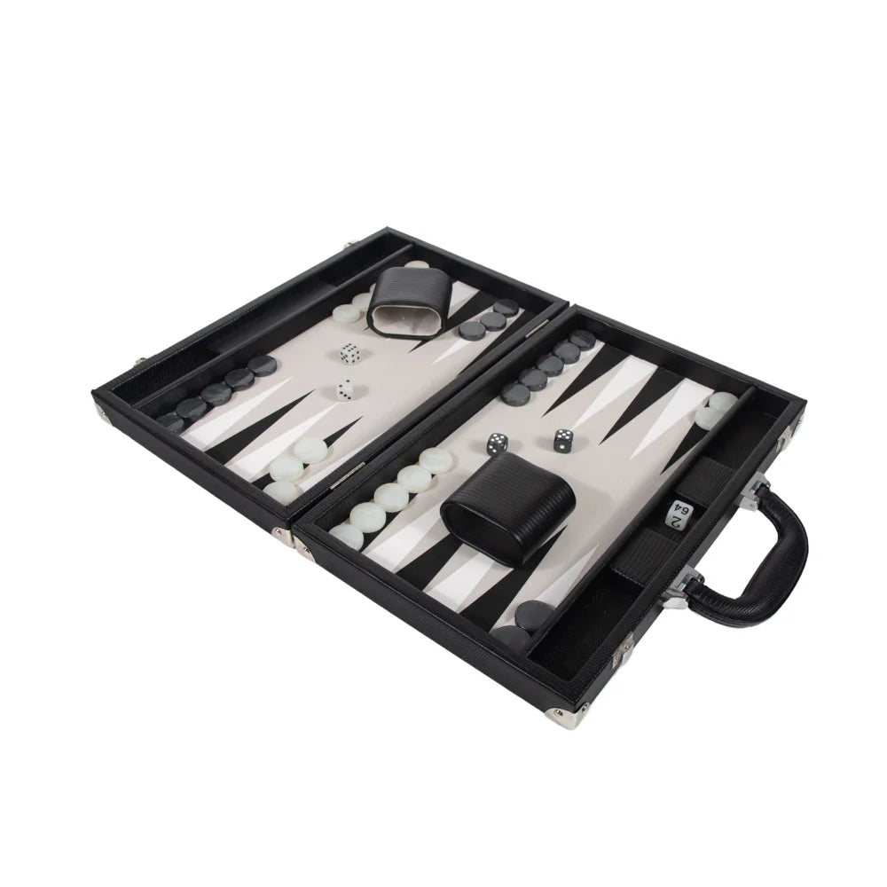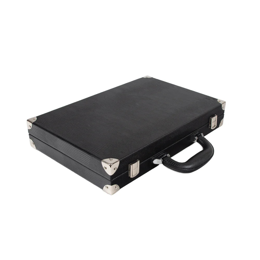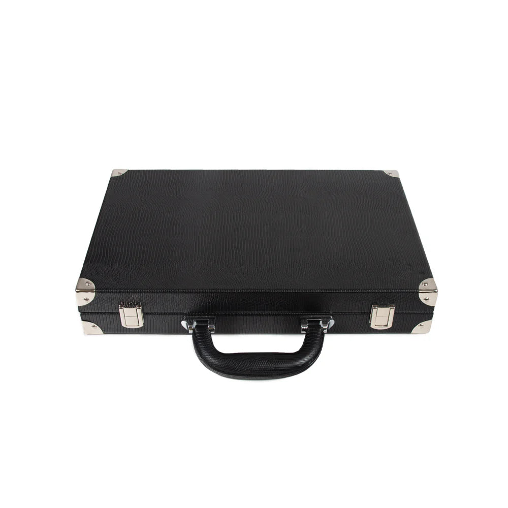 15"L x 9.75"W x 2.5"H. Presented in the best lizard vegan leather case with carrying handle and accented with metal corners. Felt interior with painted triangles, dice cup, black and ivory chips and dice. Perfect for game nights with family and friends.