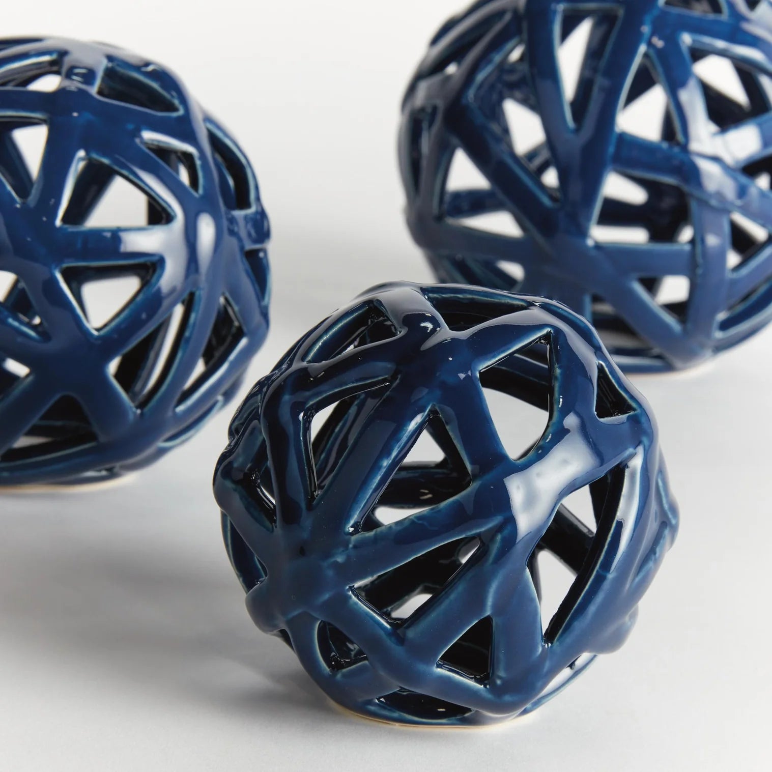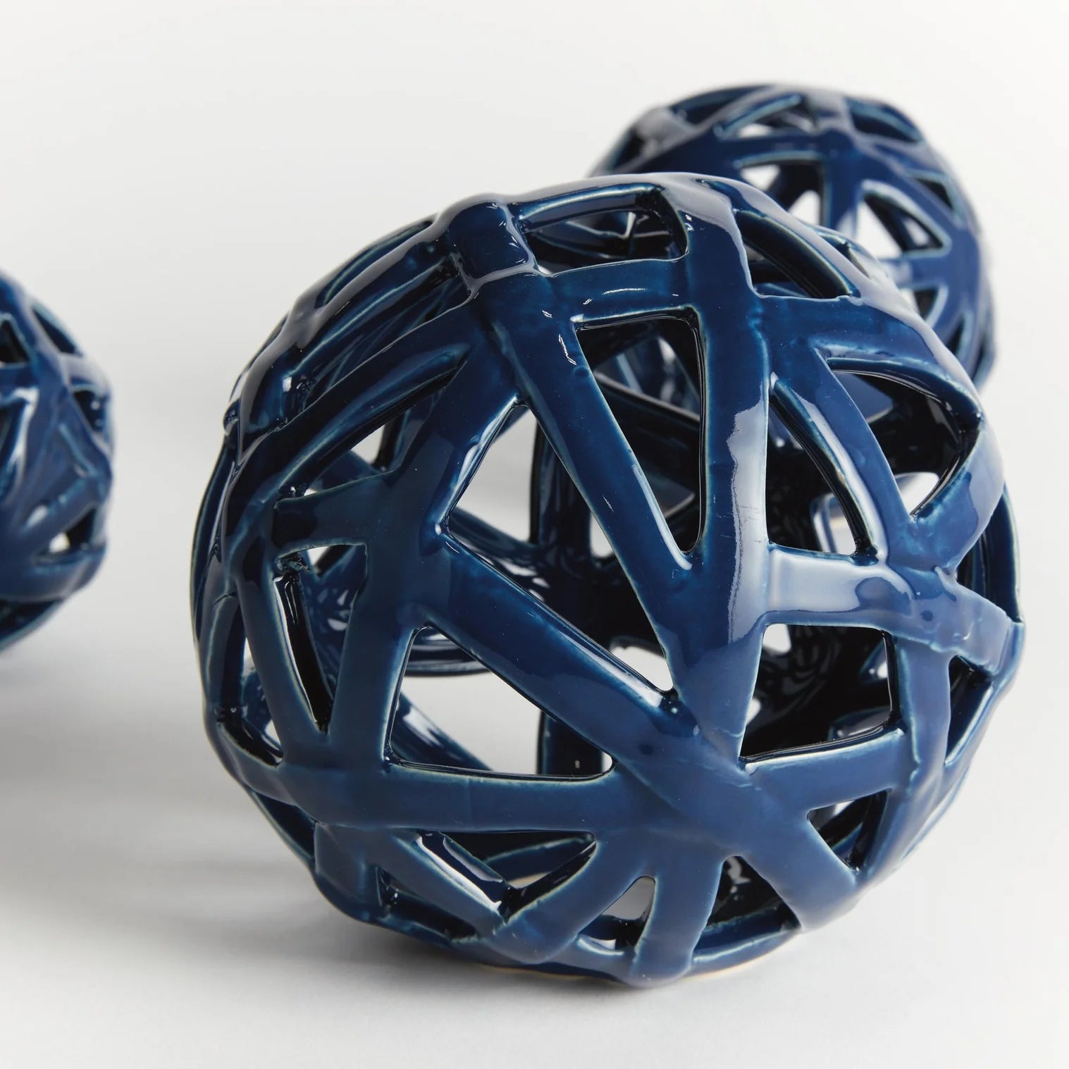 This contemporary little orb is made of thin ceramic strips, which are hand formed, and sparingly shaped into a rounded form, creating an open feel. The orb is then finished with a reactive deep blue glaze. It is perfect for a wide open bowl or tray.