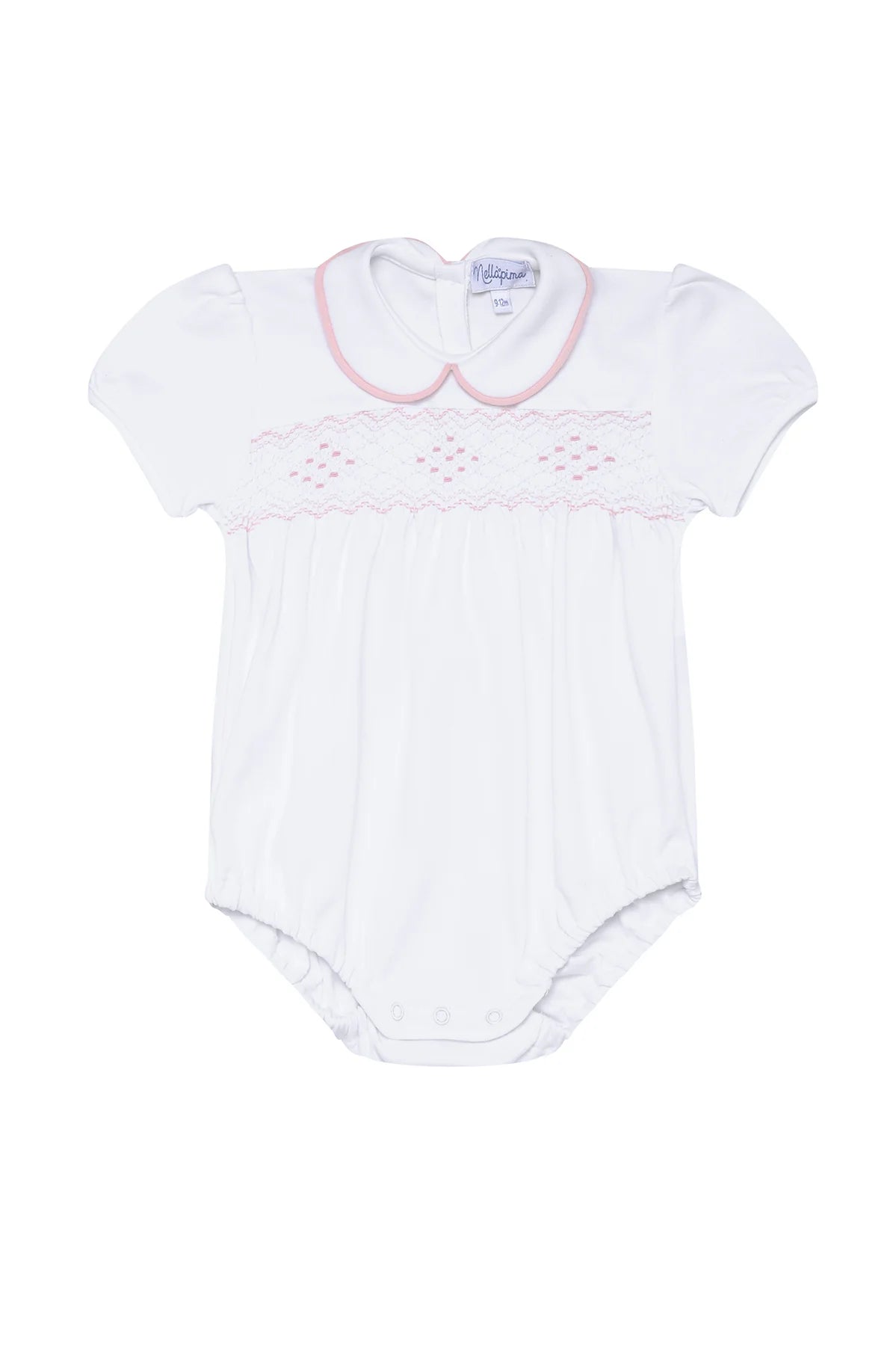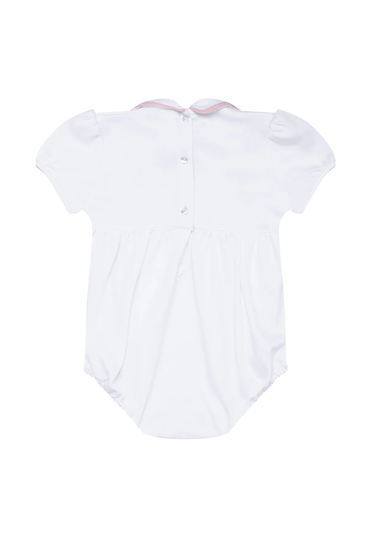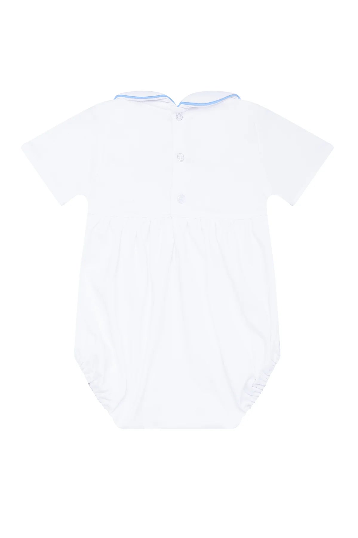 It has a perfect finish and smocked hand embroidery. Just like most things, the quality of cotton can vary greatly. The true secret behind the softness and quality comes from the northern coastal valleys of Peru, known as Peruvian Pima Cotton. The properties of this fiber create for a more durable fabric, that gives it its unparalleled luxurious touch that is most desired. Snap leg closure. Buttons located behind the collar for easy on-and-off. Short sleeve. Machine washable.