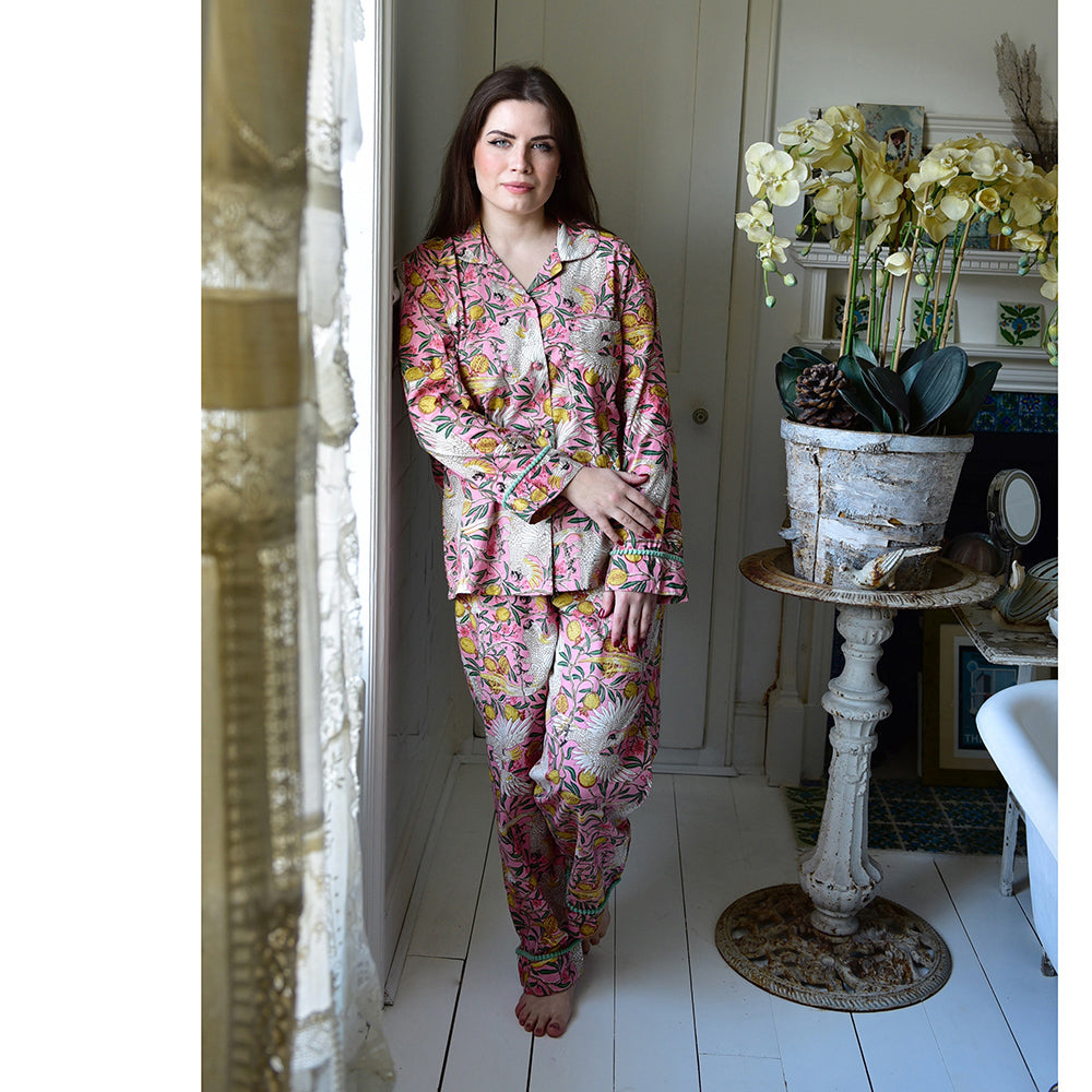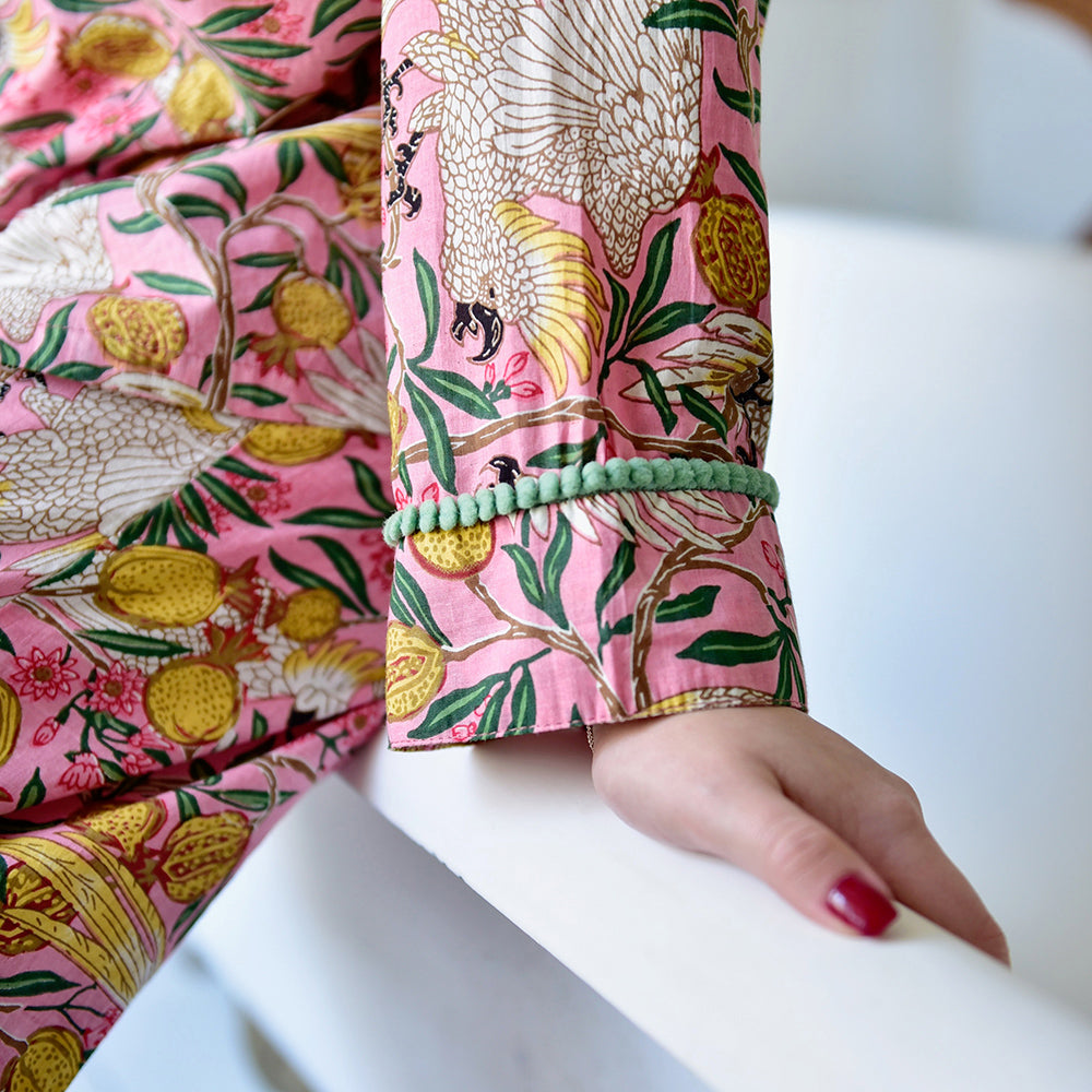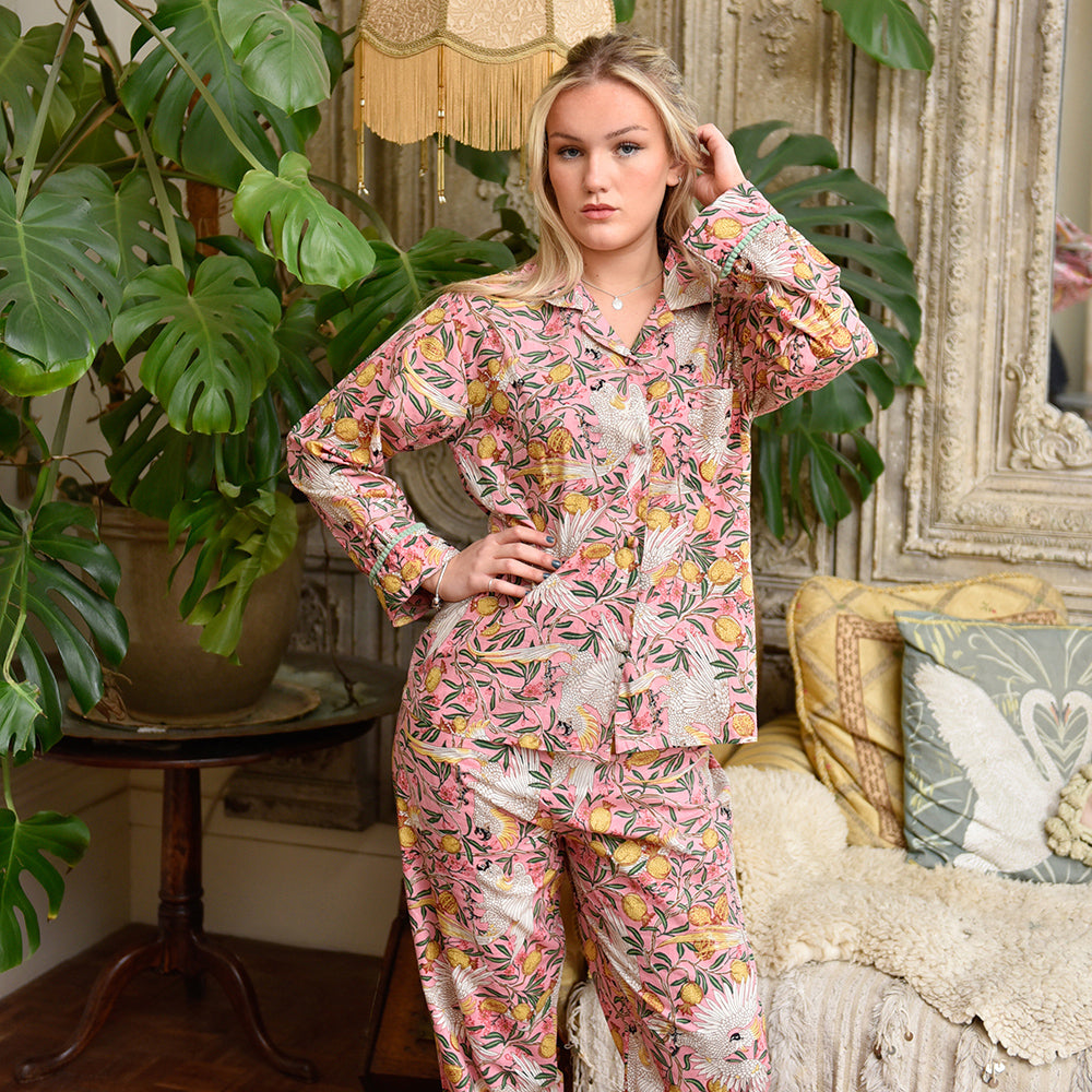 This printed pajama is made from 100% beautiful cotton – ideal for all year round. Comfortable to wear, easy to care for and perfect for packing for trips away, these pink tropical bird & pomegranate print pajamas are beautifully botanical with luscious green leaves, blooming pomegranates and lively cockatoos all set against a beautiful pink background. The jacket cuffs and trouser hems are in matching fabric with trims of small green pom poms. The pajama jacket fastens with fabric covered buttons and has a single breast pocket, and the trousers have a drawstring waist for comfort.