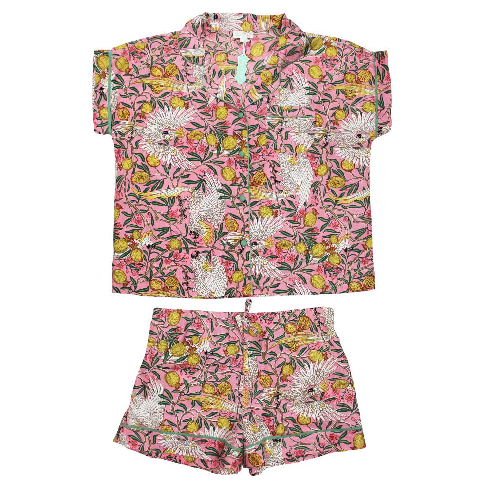 Be cool and look stylish in this short pajama set, available in a signature print. Perfect for warmer nights, these cotton pajamas feature a short-sleeved jacket and an elasticated waistband for comfort. The fabric-covered buttons and contrasting trims of the shorts, the short sleeves, and across the jacket pocket add luxurious detailing. This tropical bird & pomegranate print top and shorts set are beautifully botanical with luscious green leaves, blooming pomegranates and lively cockatoos all set against a beautiful pink background. The short sleeve top fastens with fabric-covered buttons and has a single breast pocket. The cuffs, collar and pocket are in the main body fabric and trimmed with complimentary green piping and the shorts have an elasticated drawstring waist for comfort. Overall this design is light and easy to wear, the pajama shorts set is ideal for holiday packing or for those who get too hot in bed! 100% lightweight cotton.