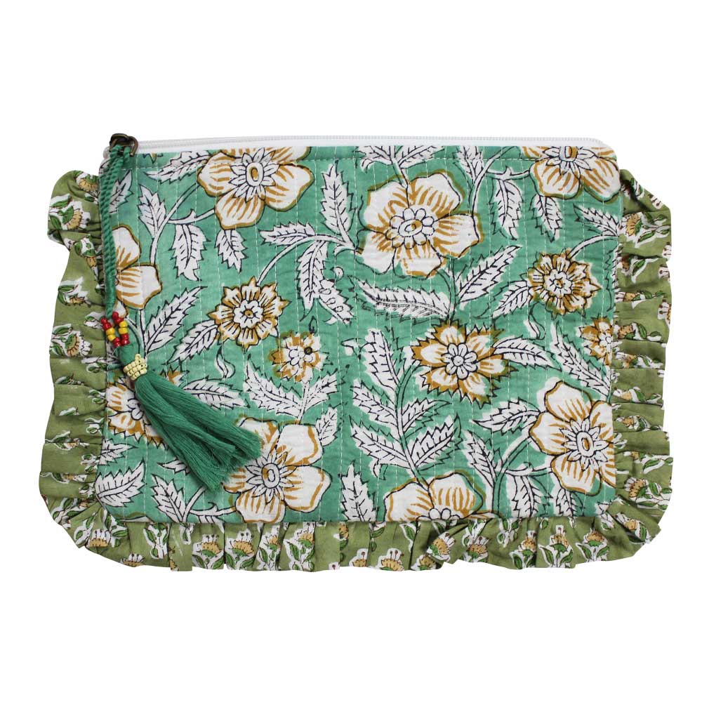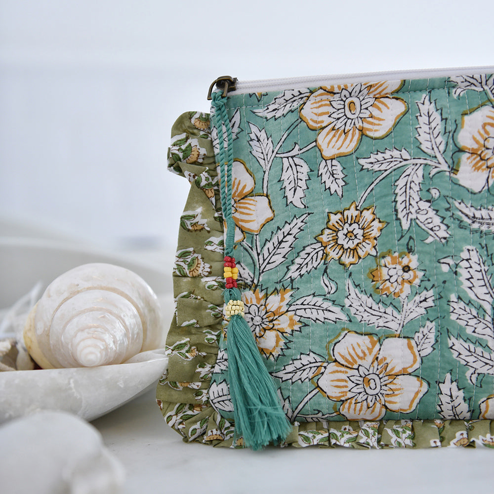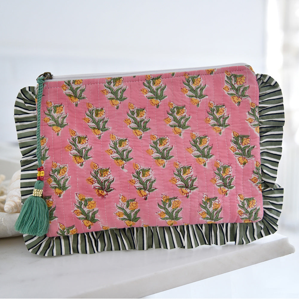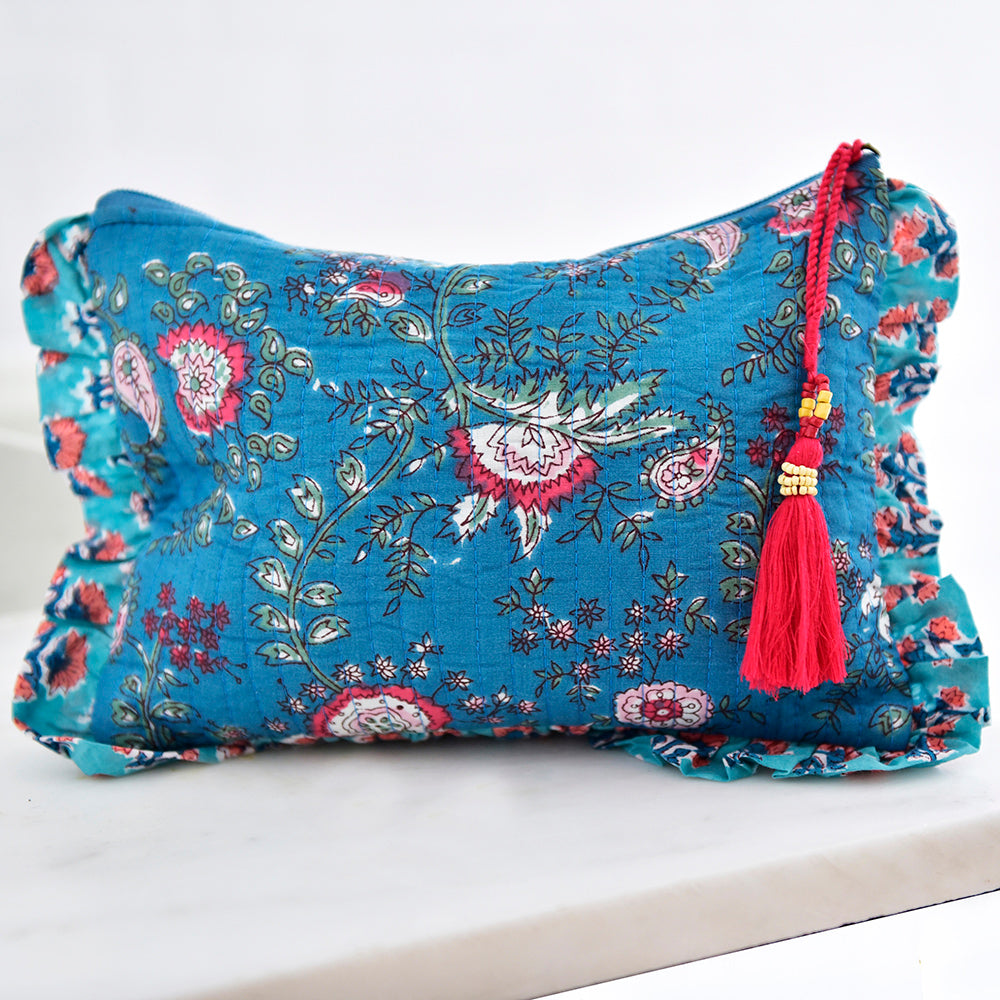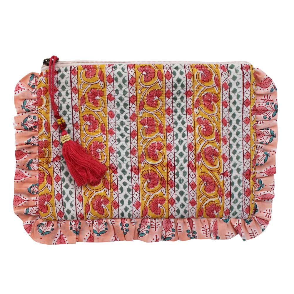 This quilted cotton makeup bag is a great size to store essential products and is perfect for popping in your handbag. The rectangular-shaped pouch has a silky lining with a zipped internal pocket, the whole body of the bag is edged with a ruffle frill and the zip pull has a beaded-trimmed tassel. Printed cotton outer.