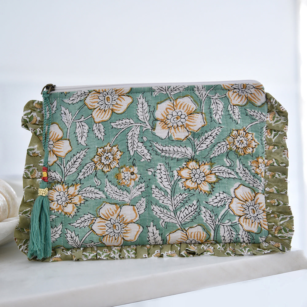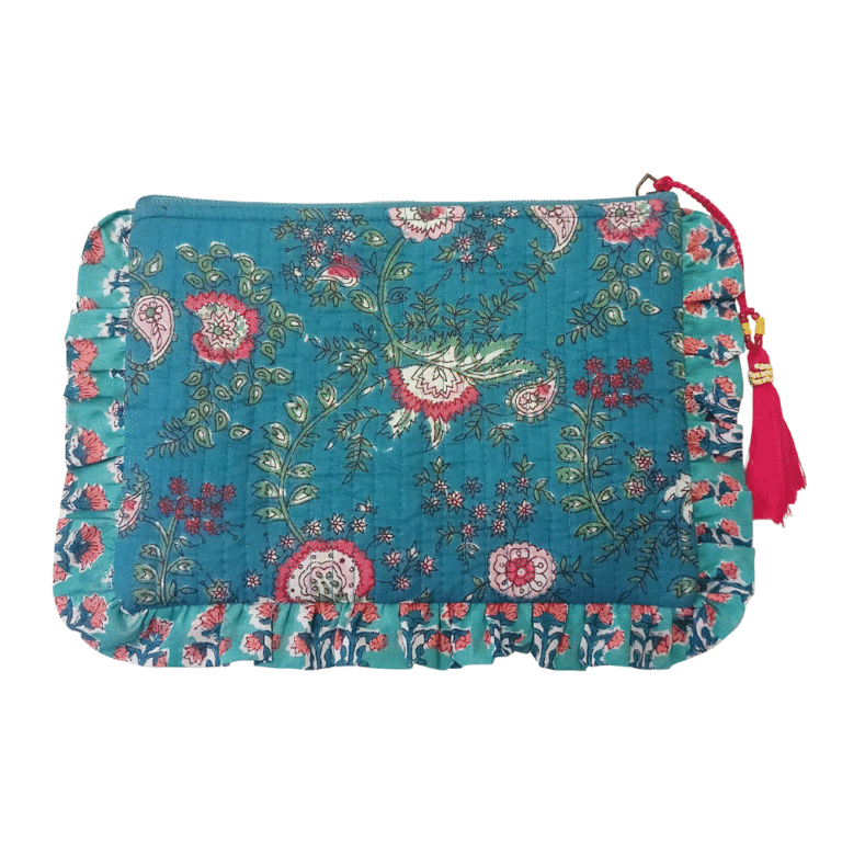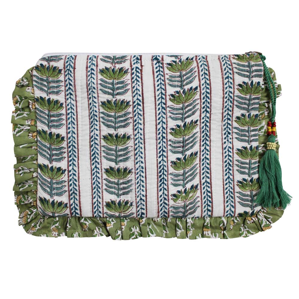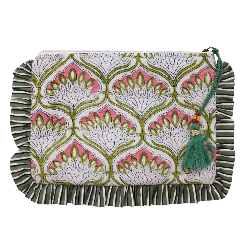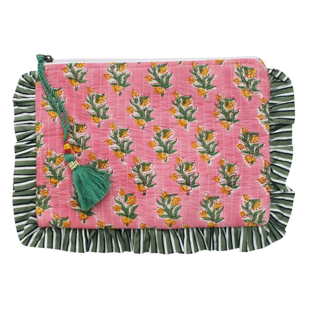 This quilted cotton makeup bag is a great size to store essential products and is perfect for popping in your handbag. The rectangular-shaped pouch has a silky lining with a zipped internal pocket, the whole body of the bag is edged with a ruffle frill and the zip pull has a beaded-trimmed tassel. Printed cotton outer.