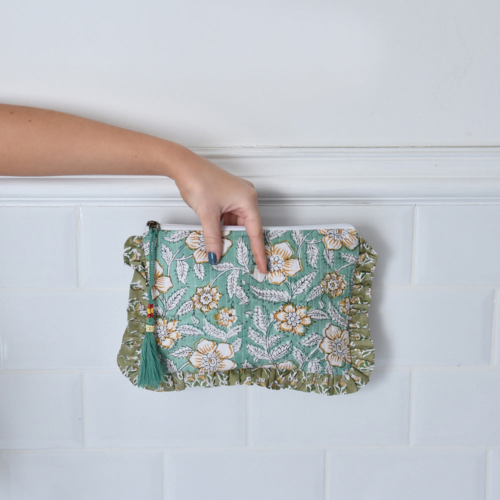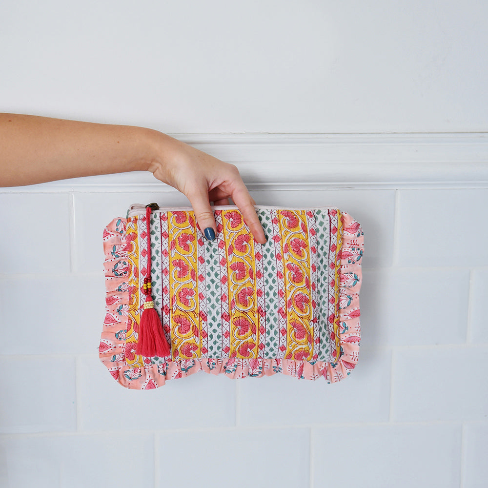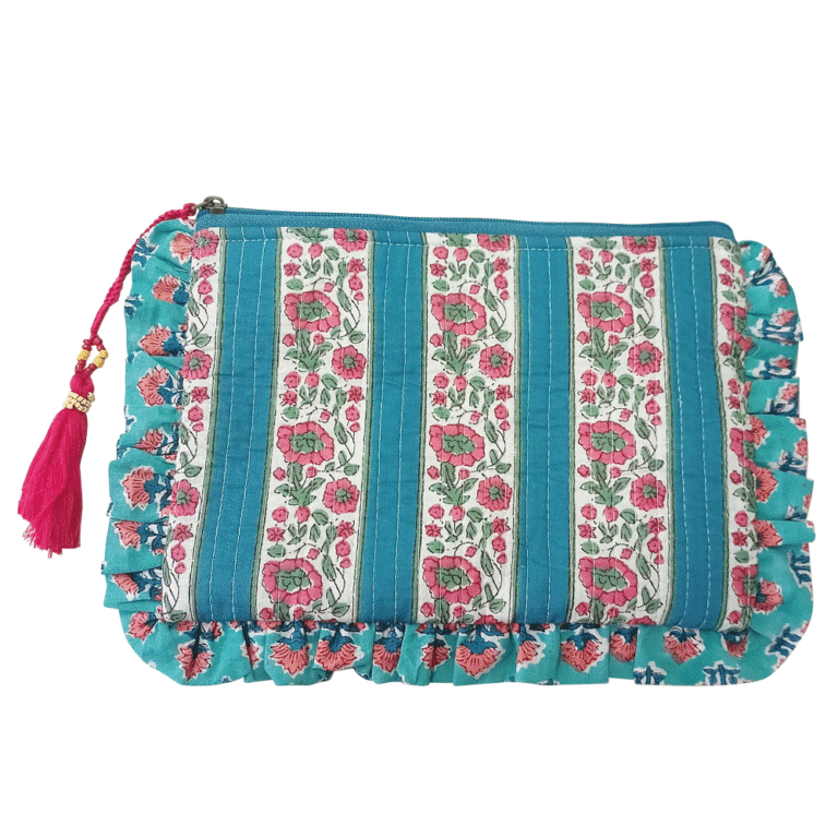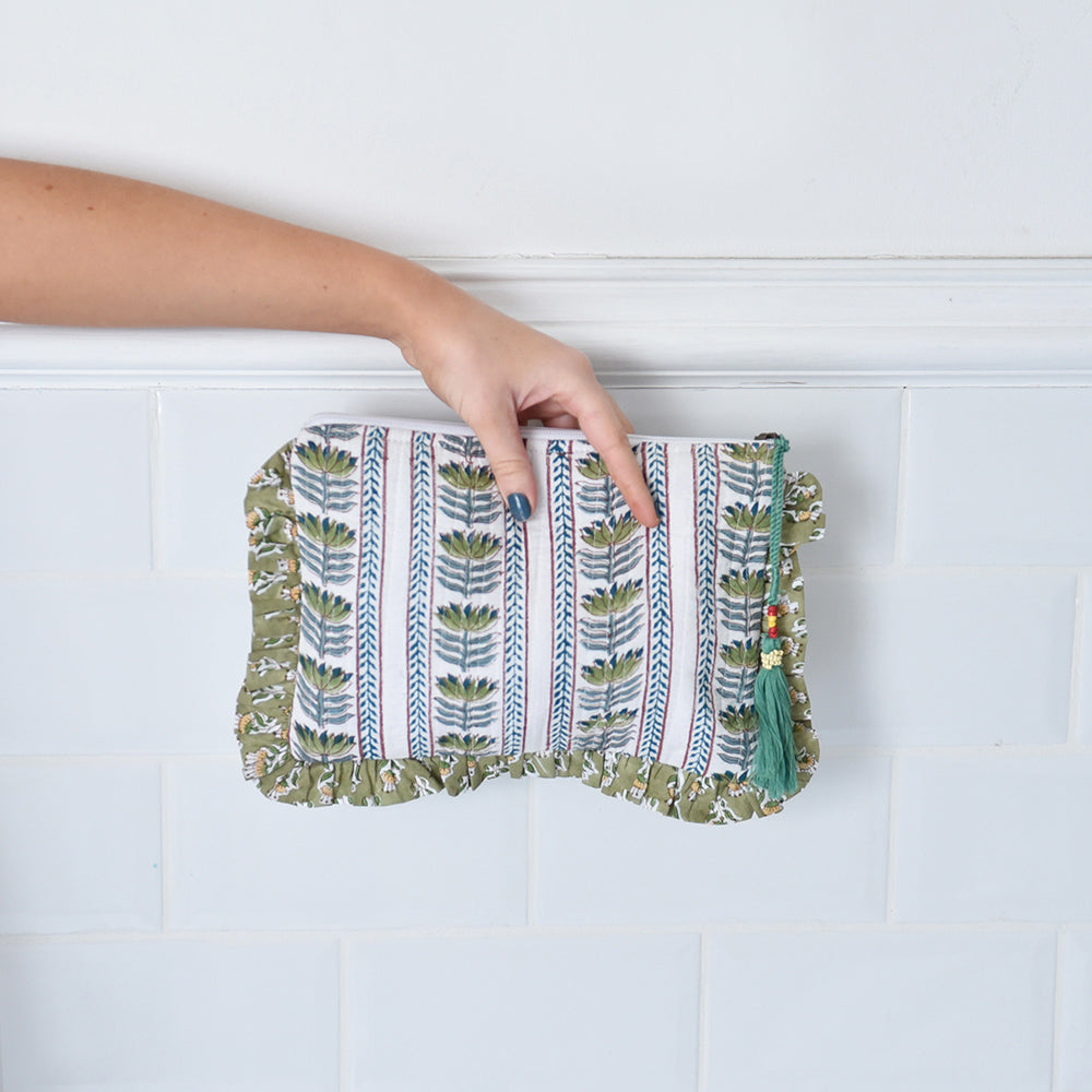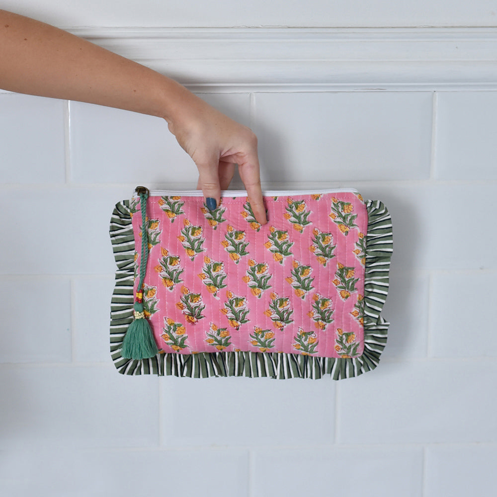 This quilted cotton makeup bag is a great size to store essential products and is perfect for popping in your handbag. The rectangular-shaped pouch has a silky lining with a zipped internal pocket, the whole body of the bag is edged with a ruffle frill and the zip pull has a beaded-trimmed tassel. Printed cotton outer.