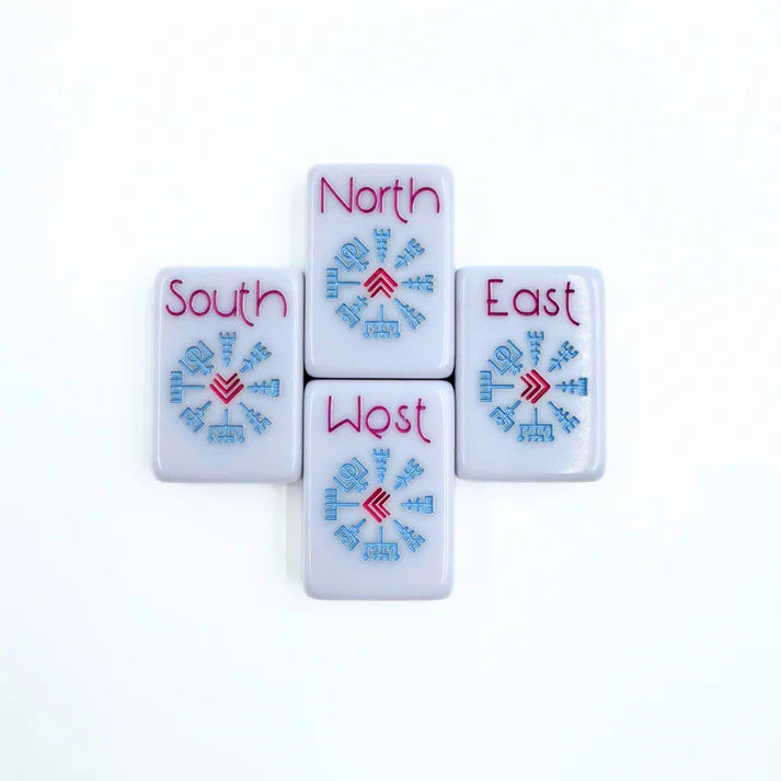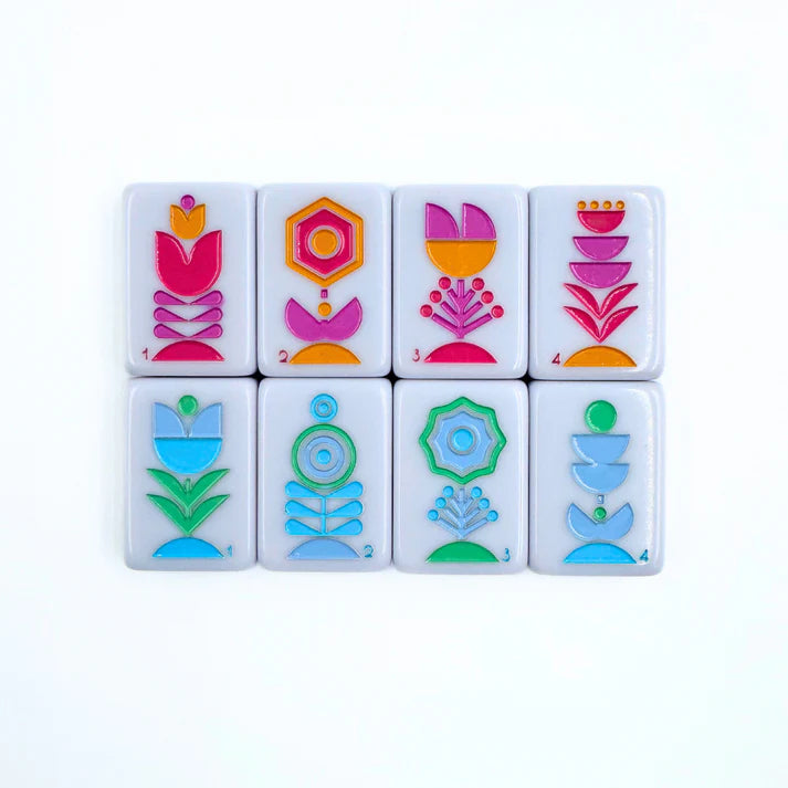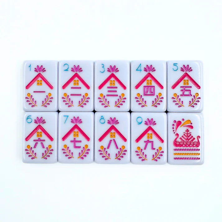 Nordic style. With beautiful symmetry and simplicity we love about Nordic style mixed with the Scandinavian folk art cuteness of the animal Jokers with amazing Viking symbols like the Viking compass winds (“vegvisir”) and the Viking ship Dragons! Beautiful bright oil-based inks hand-painted on a Fjord-White melamine tile with gray-blue undertones, this set comes with a Mint Green Tile Bag, Purple 3 Tiered Tassel, 160 tiles (with optional add-on tiles for Riichi and Singaporean styles of play), 2 dice and our infographic quick start guide! We number our flowers, which is unnecessary for the American Mah Jongg style of play, but opens up many other styles of play and it’s so important to us to keep things inclusive for as many styles of play as we can!