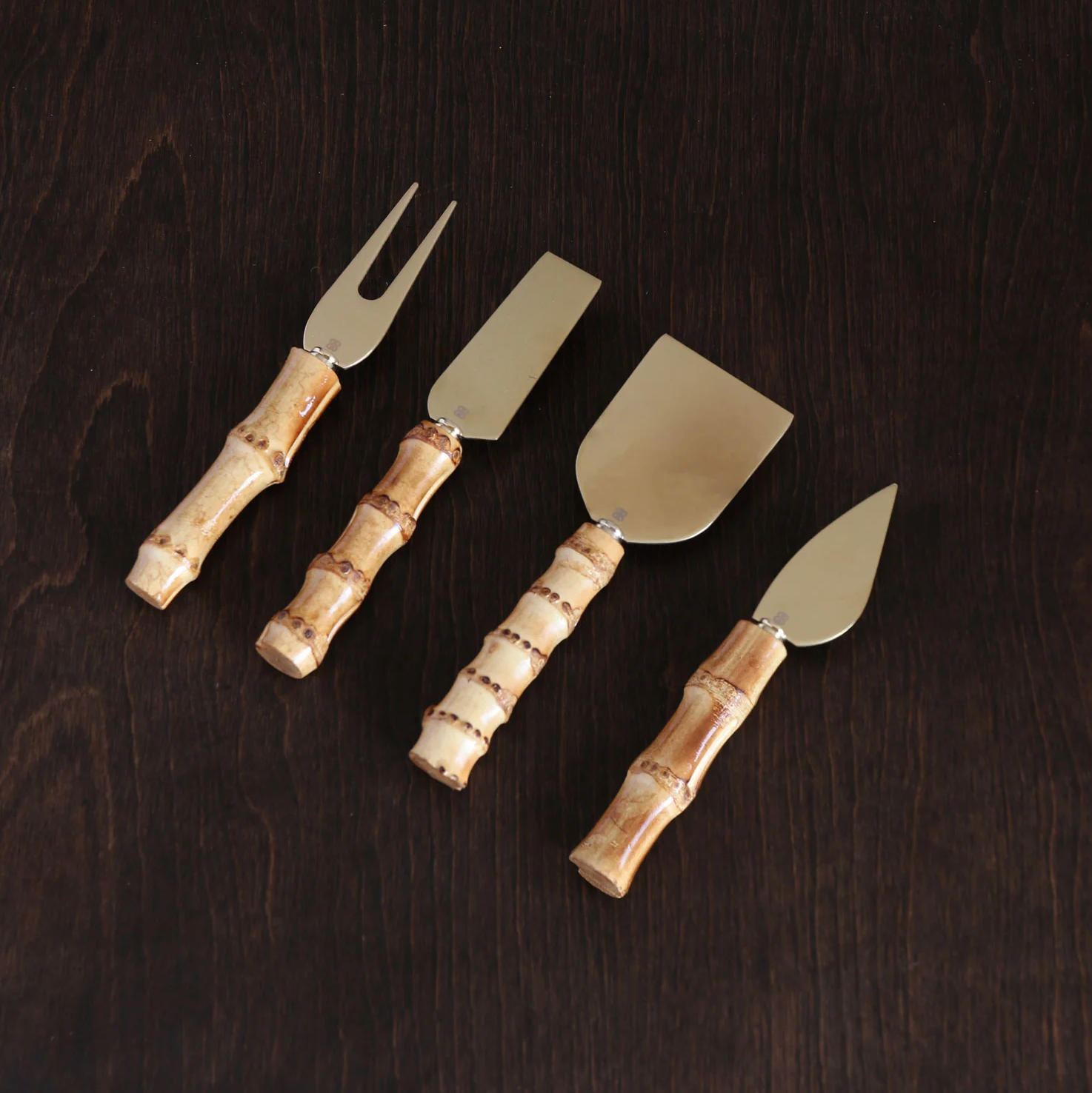 A stylish gold-tone stainless cheese set with natural bamboo handles. A 4-piece set composed of 18-8 stainless steel in a gold hue with real bamboo handles. The set includes three cheese knives and cocktail fork.