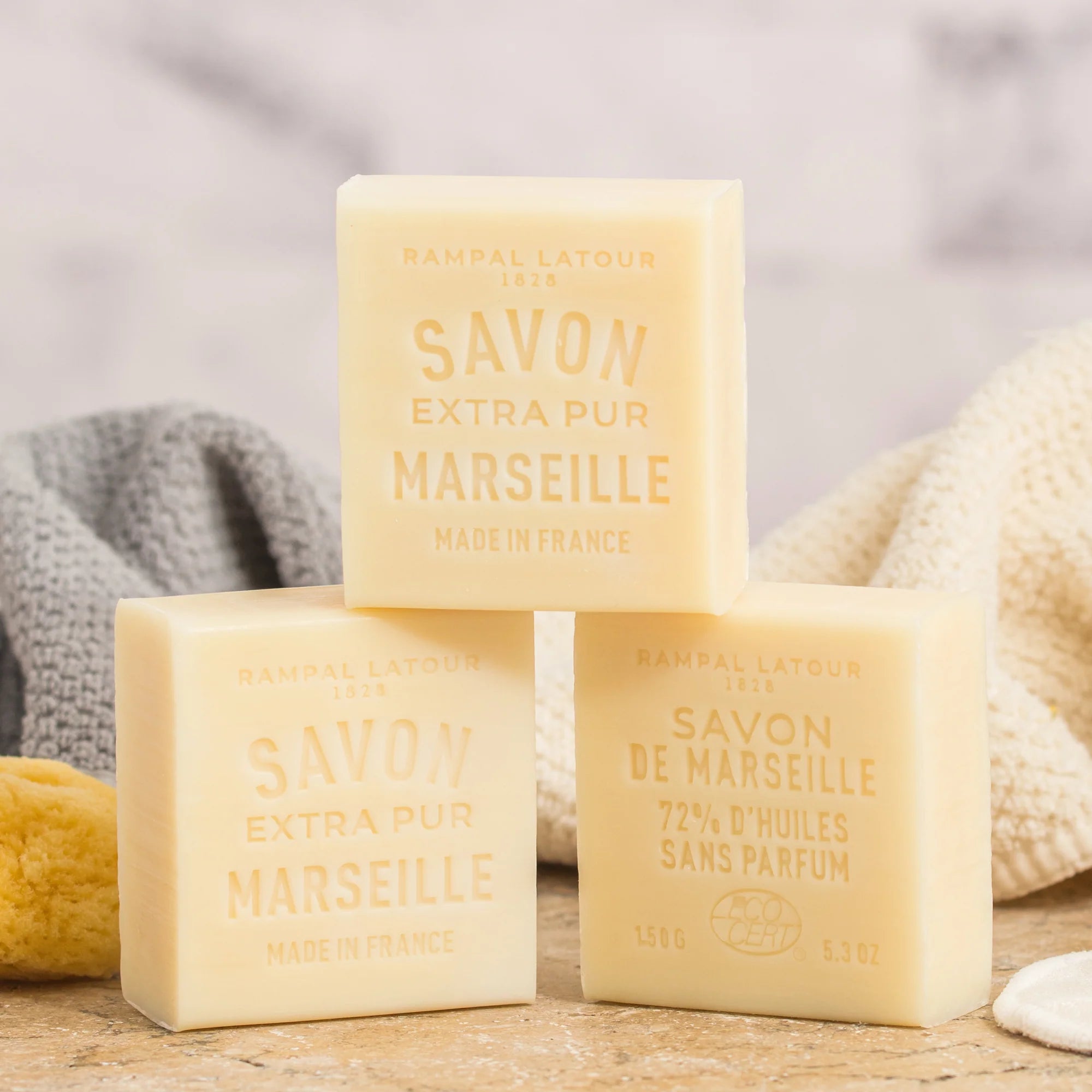 White/Vegetable Oil Bar - White Marseille soap with 100% vegetable oils is gentle on your face and body, it is rich in vegetable glycerin naturally produced during saponification (more than 7%). Thanks to this, your skin is hydrated every day. Also a great ally for the maintenance of the home and linens. Often used for a "zero waste" household, it gently washes all fabrics, including delicate textiles. It is particularly effective in removing stubborn stains. Grate your white Marseille soap to easily dilute in water and run a gentle laundry cycle for delicate clothes. Effective and practical, white Marseille soap with vegetable oils is also very economical and durable. It rinses easily and keeps its hold without breaking. This French tradition is the perfect addition for any home.