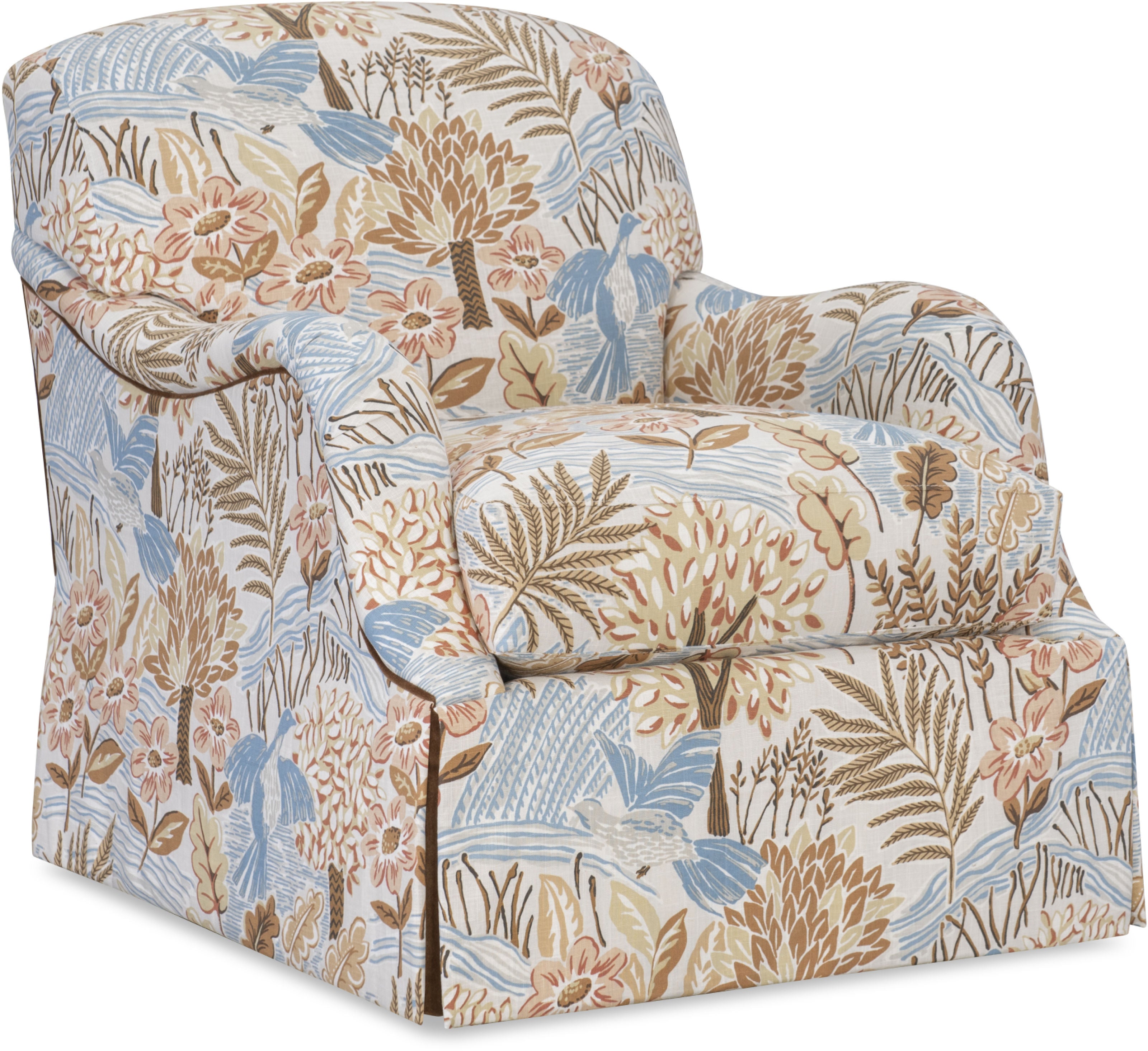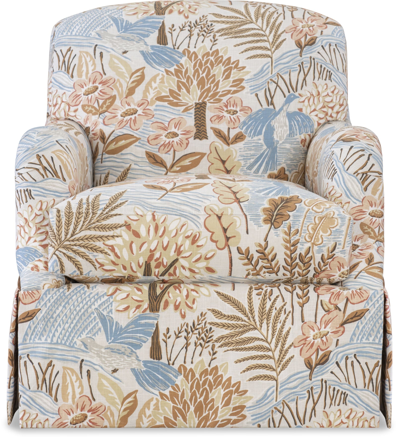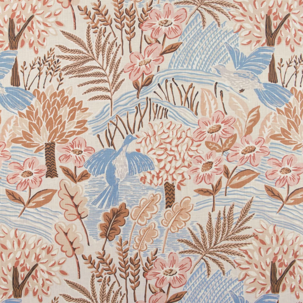 55% linen, 45% cotton. Batik-inspired print of landscapes and free-flying birds. Comfort Down cushion. Banks cognac polyester-cotton blend contrast welt and contrast skirt block. French seam. Draped skirt. Tight back. Contrast welt and skirt block fabric is as shown in fourth photo.