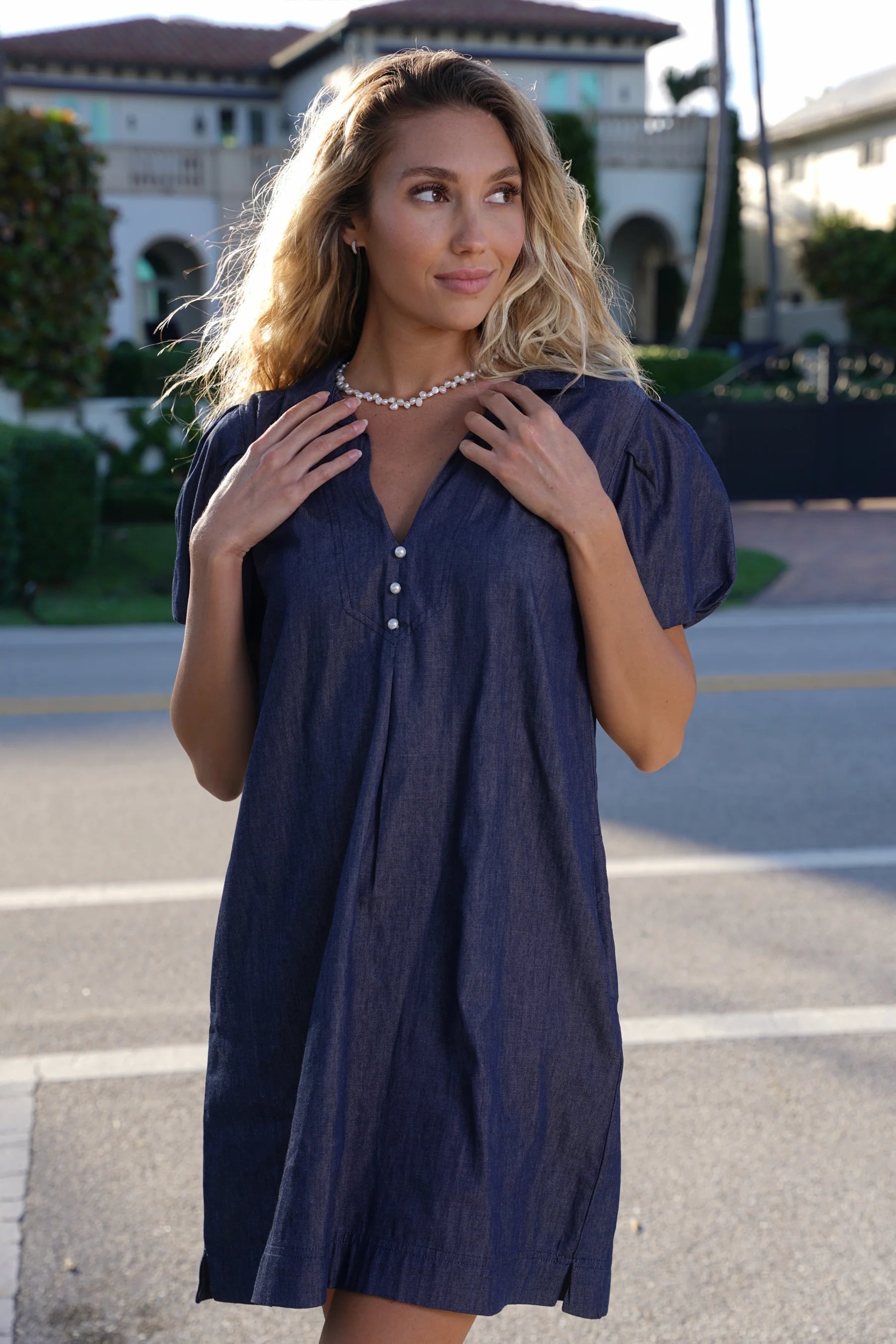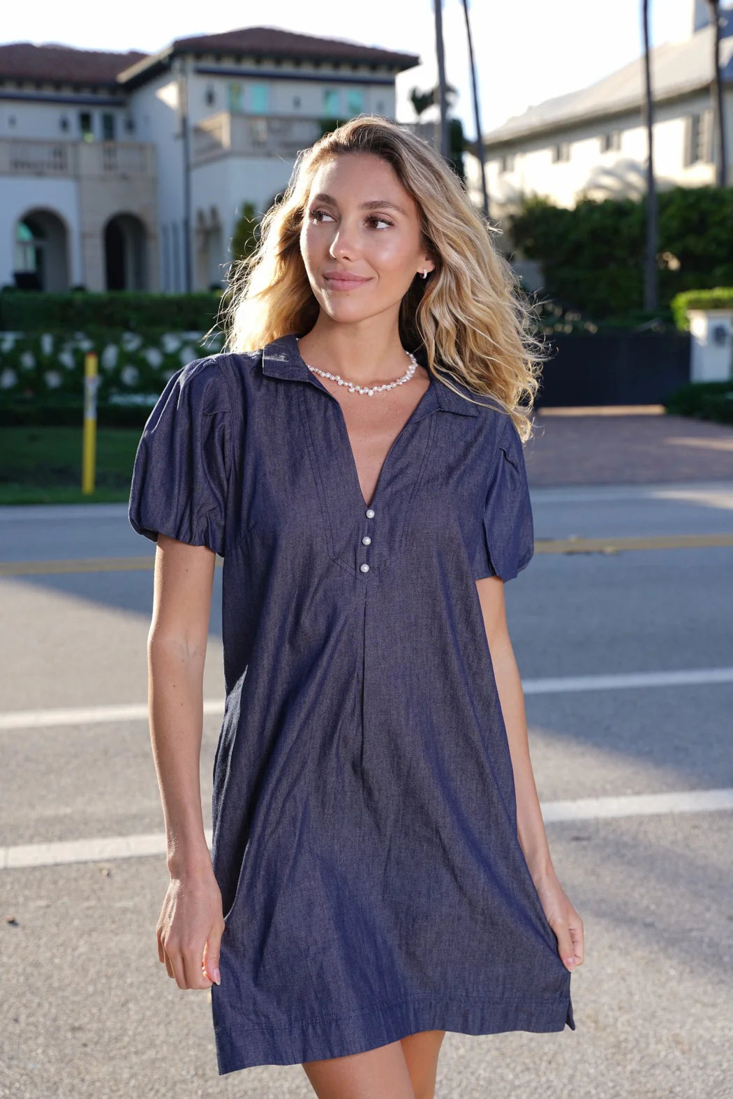 A wardrobe essential, the Virginia Dress offers timeless style with a relaxed fit and delicate pearl buttons under a flattering V-neck. Fully lined. 100% cotton or denim cotton. Three pearl buttons. Side pockets. Relaxed silhouette. 36"L.