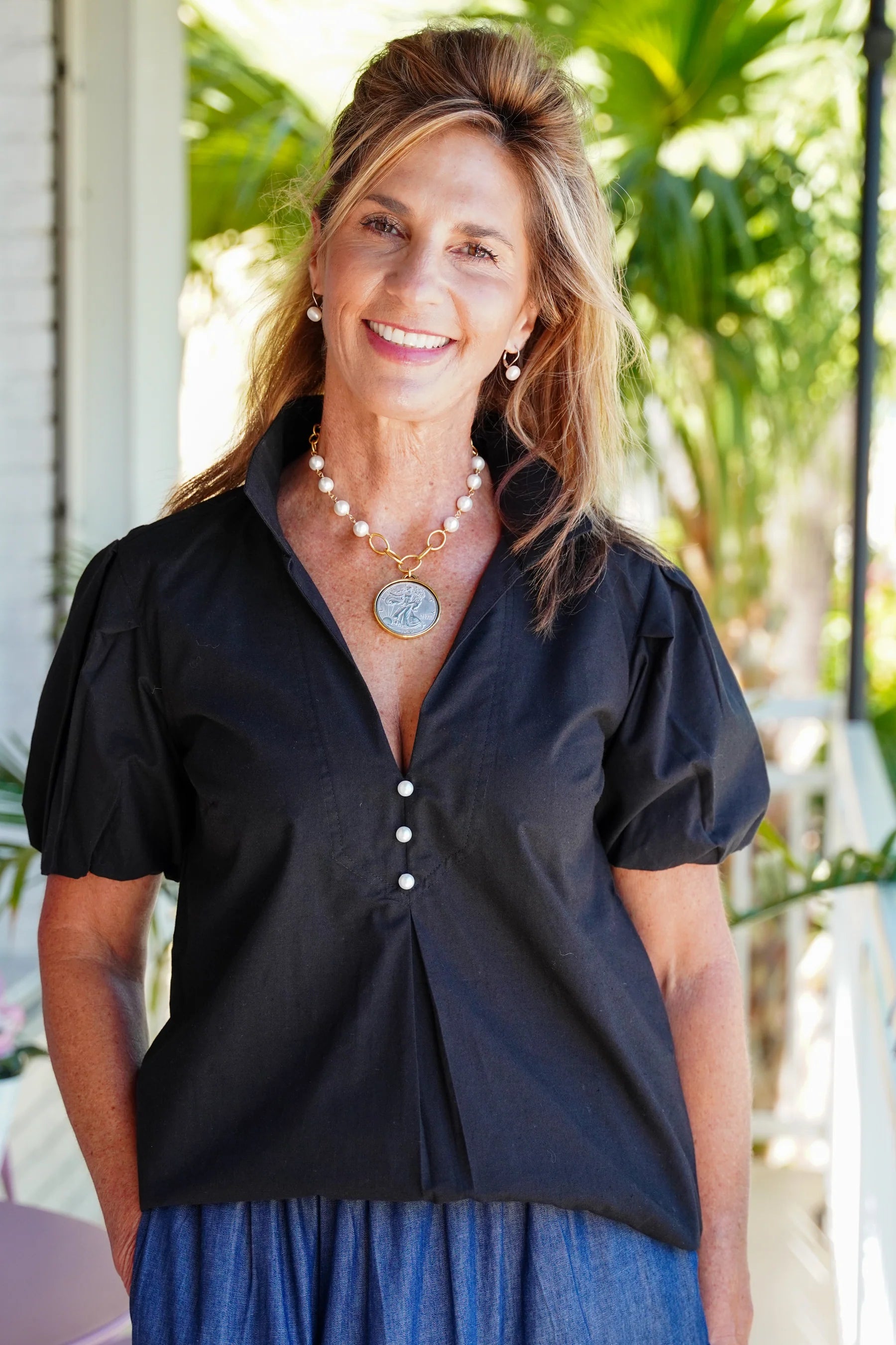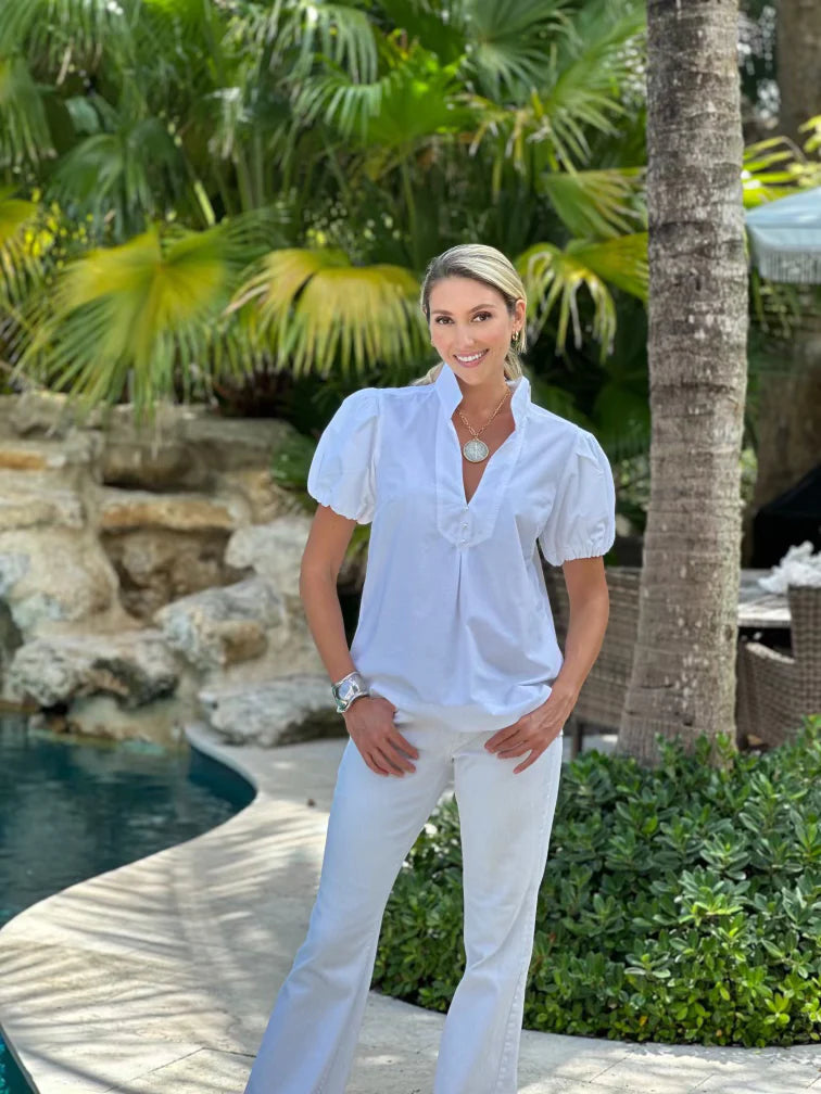 Effortlessly chic, the Virginia Top offers a relaxed fit with puff sleeves and a flattering V-neck collar for everyday style. Fully lined. Relaxed silhouette. 100% lightweight cotton.