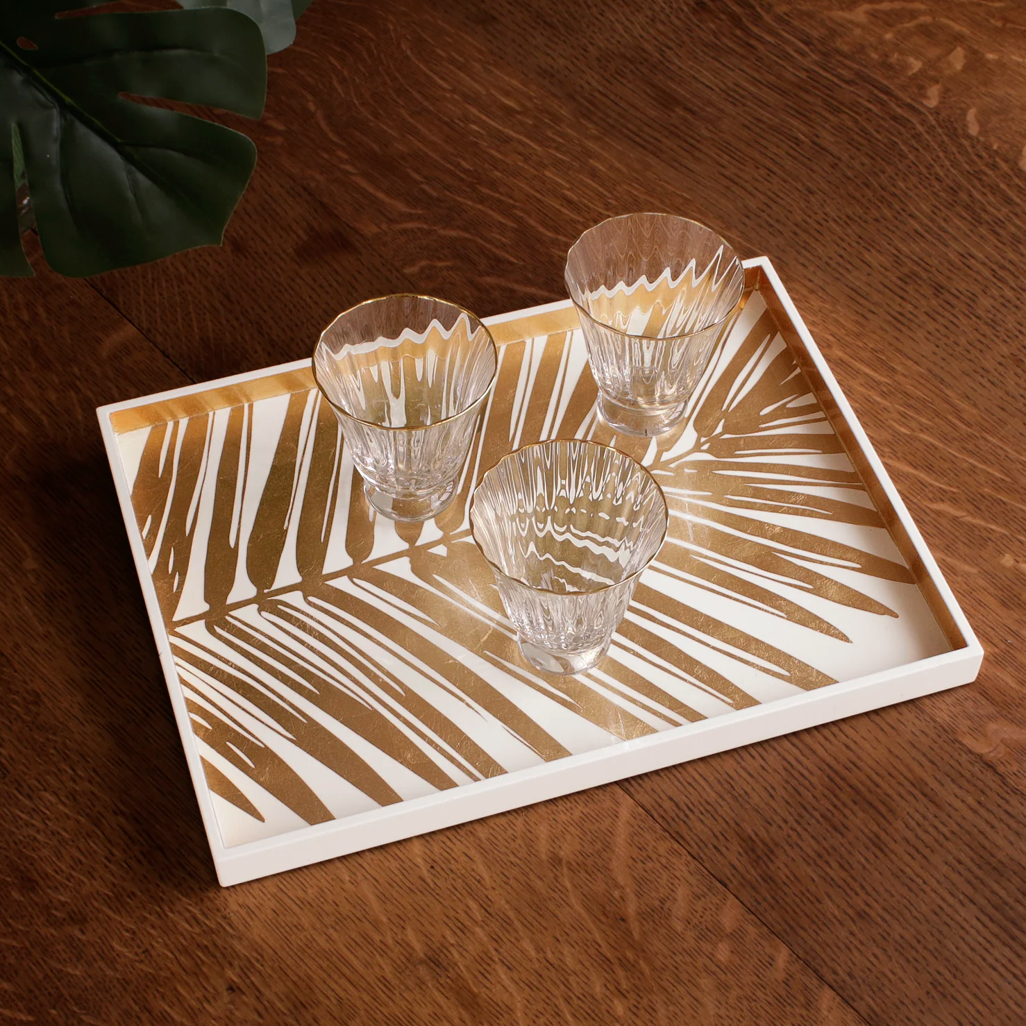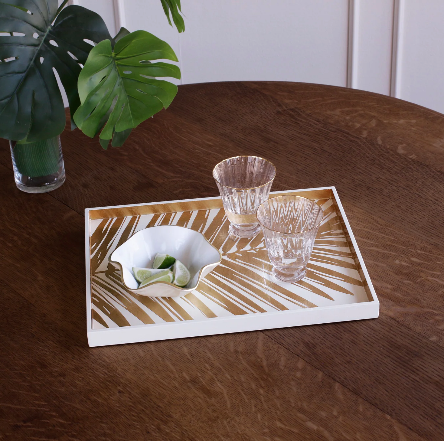 Chic style. Features a radiant palm motif against a sleek lacquered surface. A stylish gift for weddings, bridal registries, or hostess occasions, it’s a versatile piece that transitions seamlessly from entertaining to décor. Food safe and crafted from durable MDF. A touch of tropical elegance.