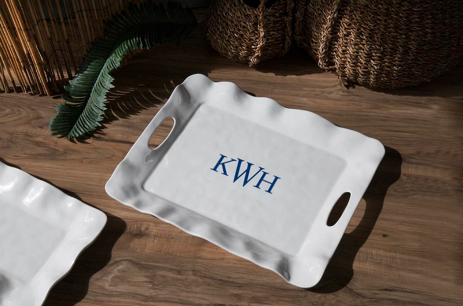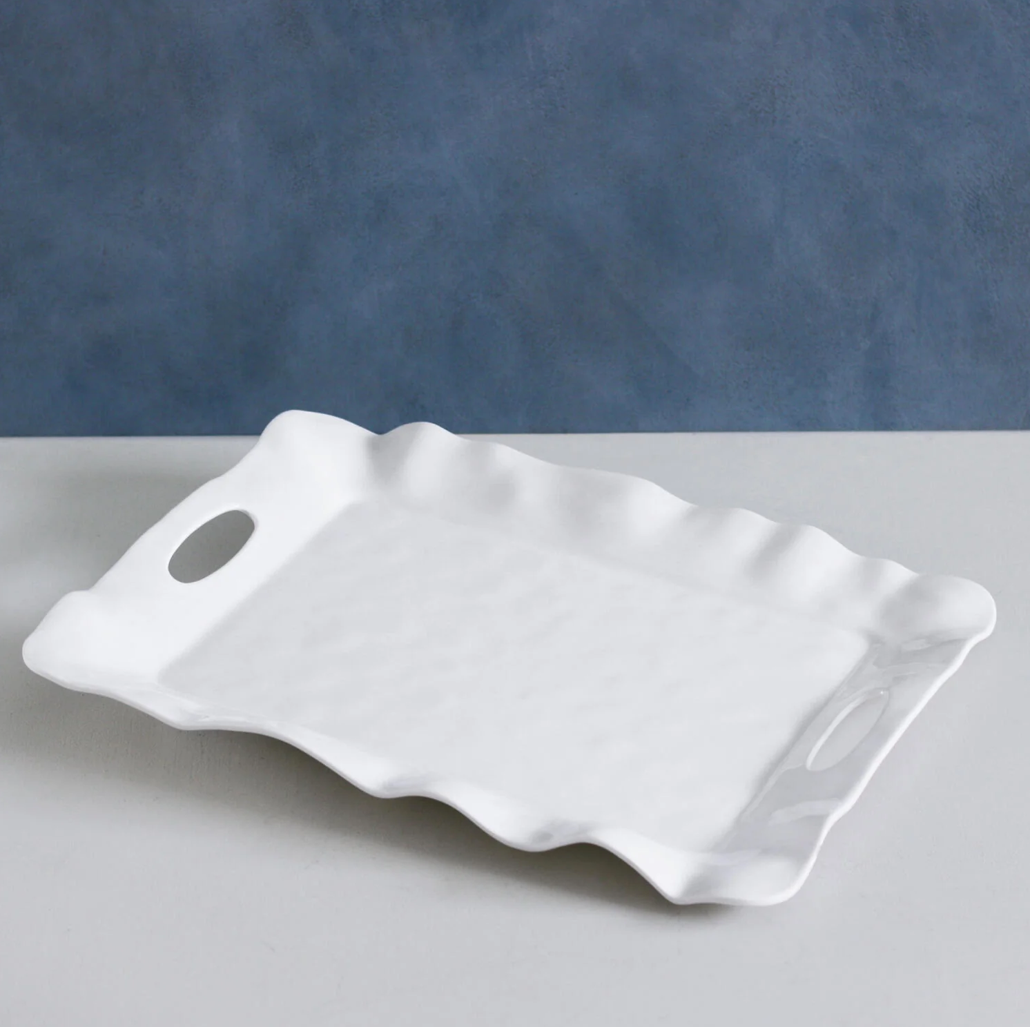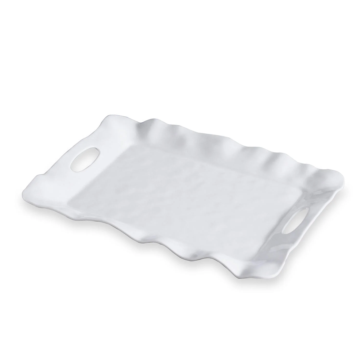 An ample serving area and notched handles make this large rectangular tray a shining star, a luxury melamine line. Fabulous for passing around snacks or drinks, it also makes a statement perched on the bar or kitchen island. Perfectly suited for indoor and outdoor entertainment, this tray is designed for everyday enjoyment. Having the substance, weight, and appearance of ceramics, this white melamine tray is as beautiful as it is versatile. Makes a unique gift.